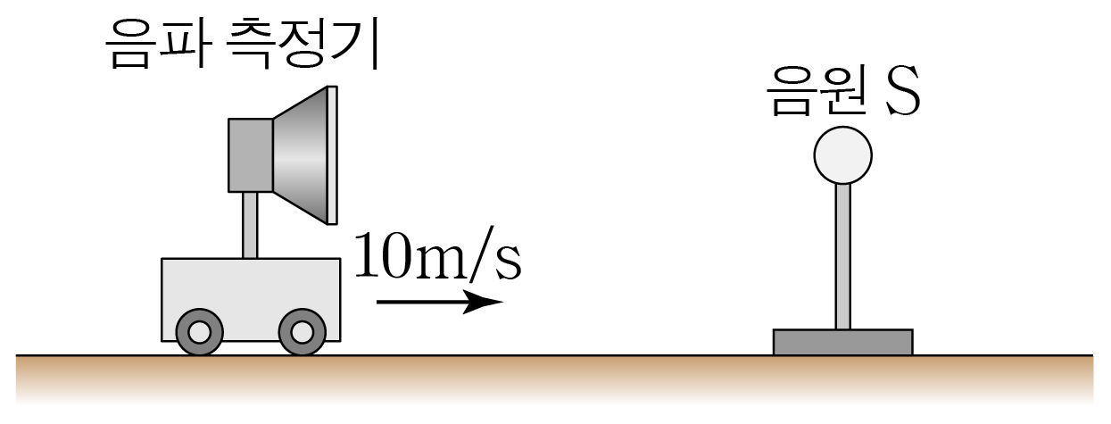 그림은 음파 측정기가 정지해 있는 음원 S \,\mathrm{S}\,S 를 향해 10 m / s 10\,\mathrm{m/s}1 0 m / s 의 속력으로 등속도 운동하는 모습을 나타낸 것이다. S \mathrm{S}S 는 진동수가 680 H z 680\,\mathrm{Hz}6 8 0 H z 인 음파를 발생시키며 음파 측정기에 측정된 음파의 진동수는 f ff 이다. 음속은 340 m / s 340\,\mathrm{m/s}3 4 0 m / s 로 일정할 때, f ff 를 구해보자.