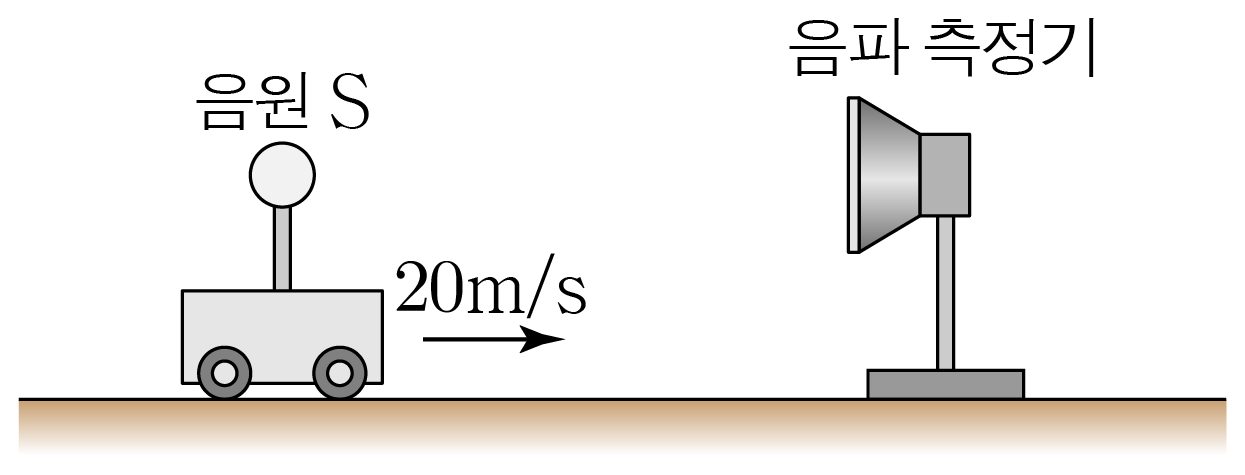 그림은 음원 S \,\mathrm{S}\,S 가 정지해 있는 음파 측정기를 향해 20 m / s 20\,\mathrm{m/s}2 0 m / s 의 속력으로 등속도 운동하는 모습을 나타낸 것이다. S \mathrm{S}S 는 진동수가 320 H z 320\,\mathrm{Hz}3 2 0 H z 인 음파를 발생시키며 음파 측정기에 측정된 음파의 진동수는 f ff 이다. 음속은 340 m / s 340\,\mathrm{m/s}3 4 0 m / s 로 일정할 때, f ff 를 구해보자.
