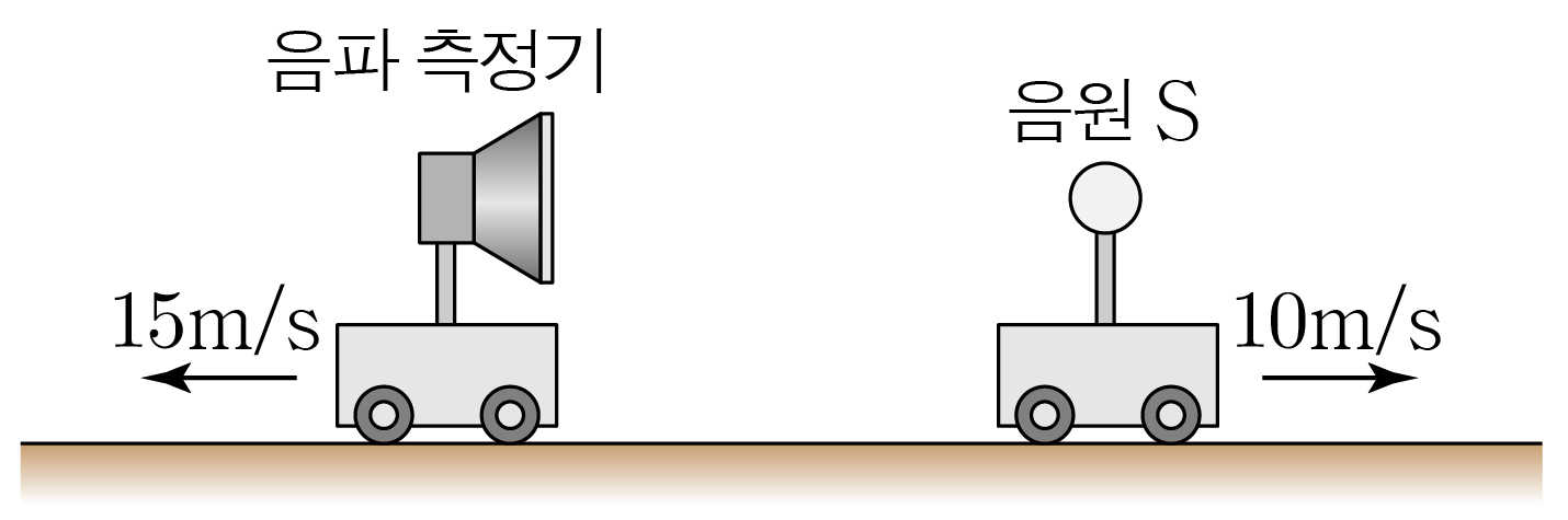 그림은 음파 측정기와 음원 S \,\mathrm{S}\,S 가 각각 일정한 속력 15 m / s , 15\,\mathrm{m/s},1 5 m / s , 10 m / s 10\,\mathrm{m/s}1 0 m / s 로 동일 직선상에서 반대 방향으로 운동하는 모습을 나타낸 것이다. S \mathrm{S}S 는 진동수가 700 H z 700\,\mathrm{Hz}7 0 0 H z 인 음파를 발생시키며 음파 측정기에 측정된 음파의 진동수는 f ff 이다. 음속은 340 m / s 340\,\mathrm{m/s}3 4 0 m / s 로 일정할 때, f ff 를 구해보자.