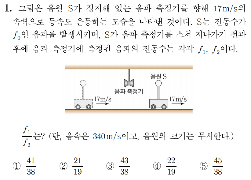 관찰자(음파 측정기)가 음원(S \mathrm{S}S )에 멀어지는 방향으로 운동하고 있으므로 ± \pm± 는 + ++ 와 − -− 중 − -− 이다.