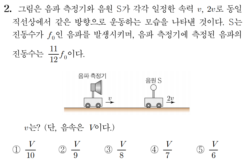 파동의 진동수를 f 0 f_0f 0 관측한 파동의 진동수를 f 1 , f_1,f 1 , 음속을 V , V,V , 관찰자의 속력을 v , v,v , 음원의 속력을 2 v 2v2 v 라 할 때,