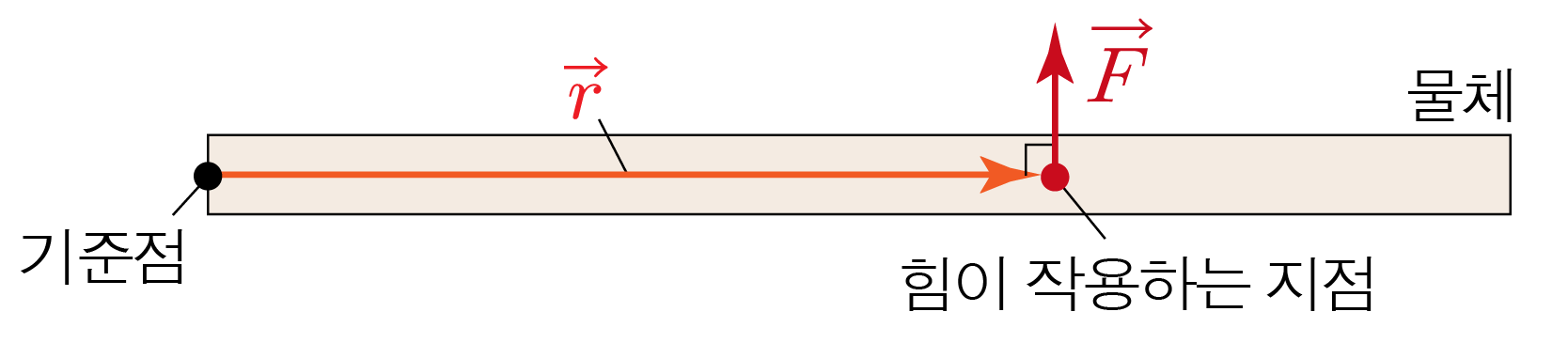 기준점으로부터 힘이 작용한 지점까지의 벡터를 r → \overrightarrow{r}r 이라 하고, r → \overrightarrow{r}r 에 수직으로 작용하는 힘 또는 성분을 F → \overrightarrow{F}F 라 할 때, r → × F → \overrightarrow{r} \times \overrightarrow{F}r × F 인 물리량이다.