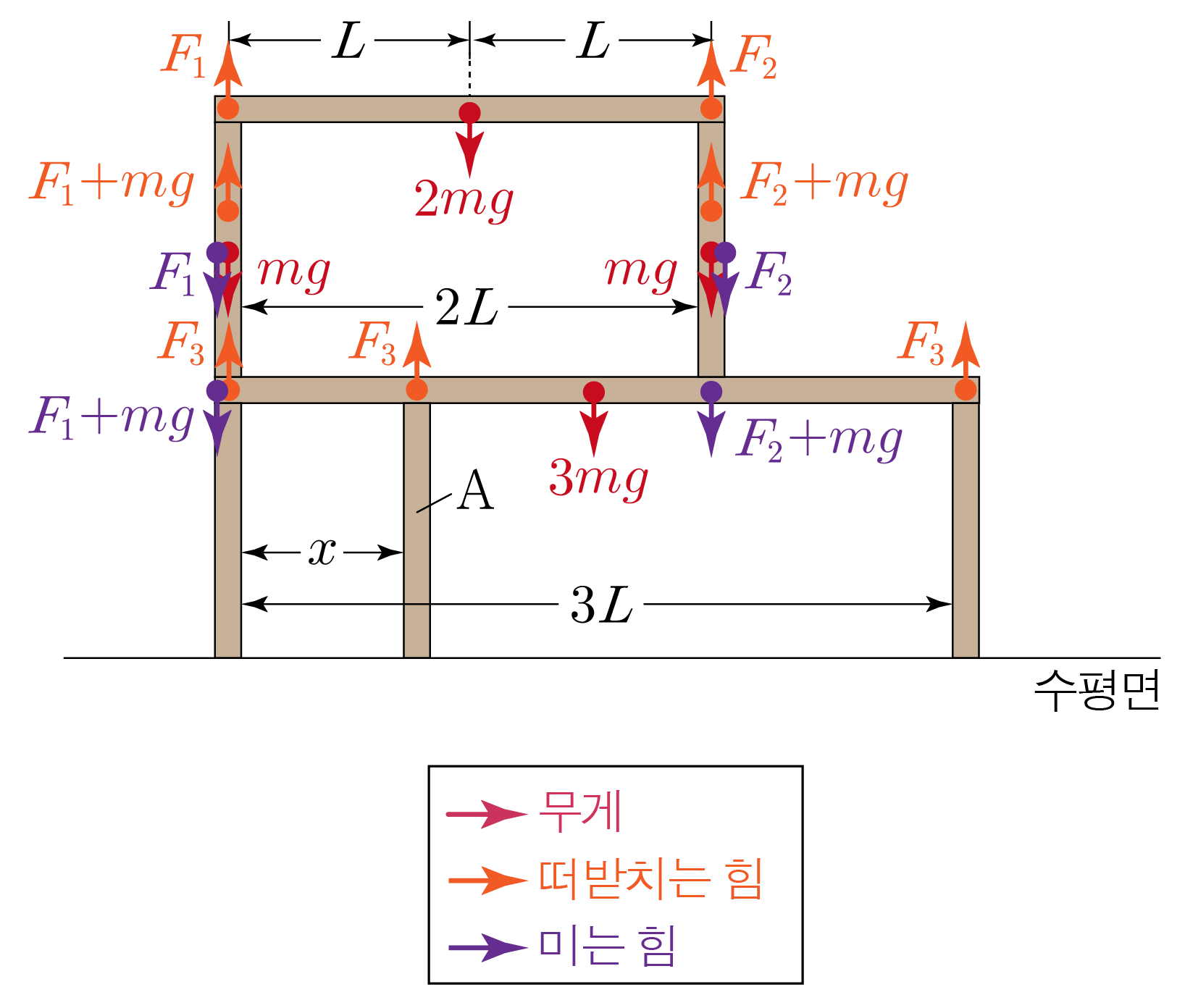그러므로 1 11 층 기둥이 떠받치는 힘의 크기를 F 3 F_3F 3 이라 할 때, 막대와 2 22 층 기둥에 작용하는 모든 힘을 표기하면 아래 그림과 같다.