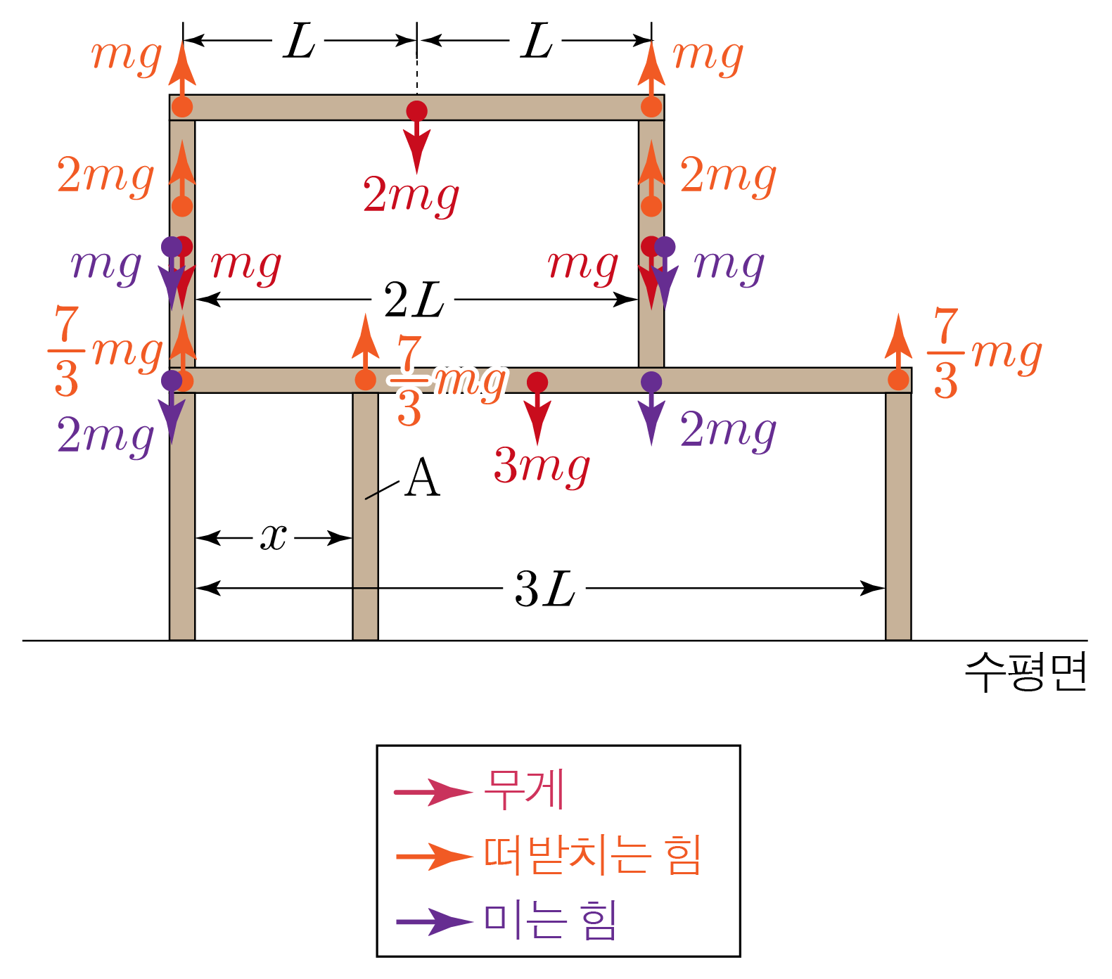 F 1 = m g , F 2 = m g , F 3 = 7 3 m g F_1 = mg,\,F_2 = mg,\,F_3 = \frac{7}{3}mgF 1 = m g , F 2 = m g , F 3 = 3 7 m g 이므로 막대와 2 22 층 기둥에 작용하는 모든 힘을 표기하면 아래 그림과 같다.