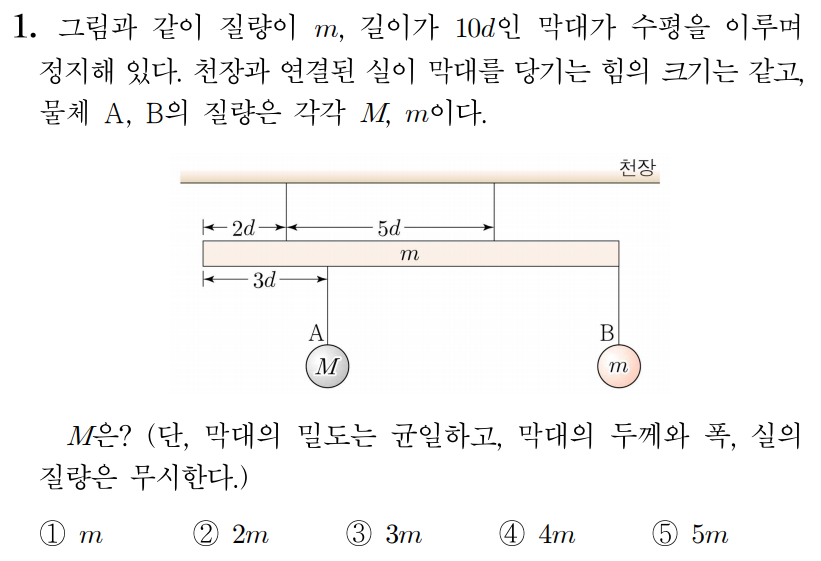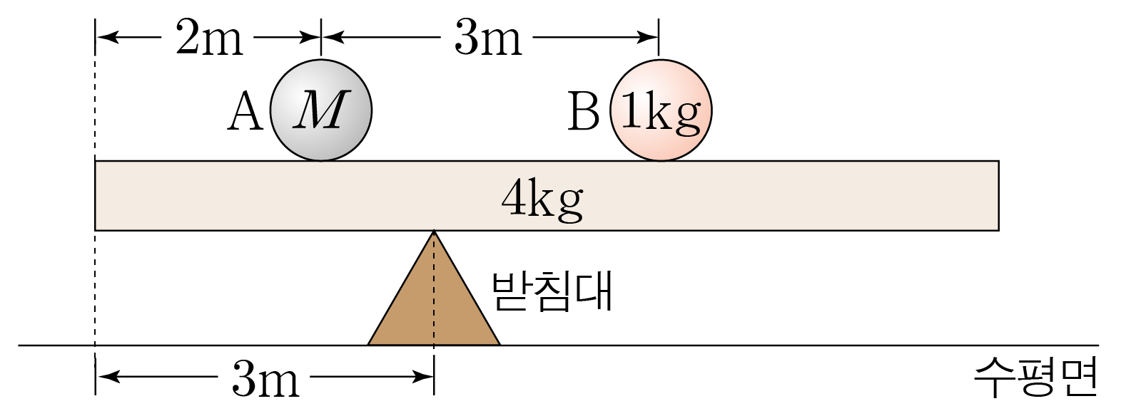 막대, A \mathrm{A}A , B \mathrm{B}B 를 각각 1 11 , 2 22 , 3 33 번째 물체라 하면 m 1 = 4 k g m_1 = 4\,\mathrm{kg}m 1 = 4 k g , m 2 = M m_2 = Mm 2 = M , m 3 = 1 k g m_3 = 1\,\mathrm{kg}m 3 = 1 k g 이다.