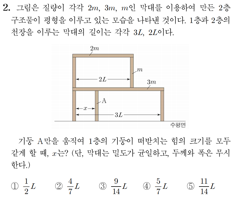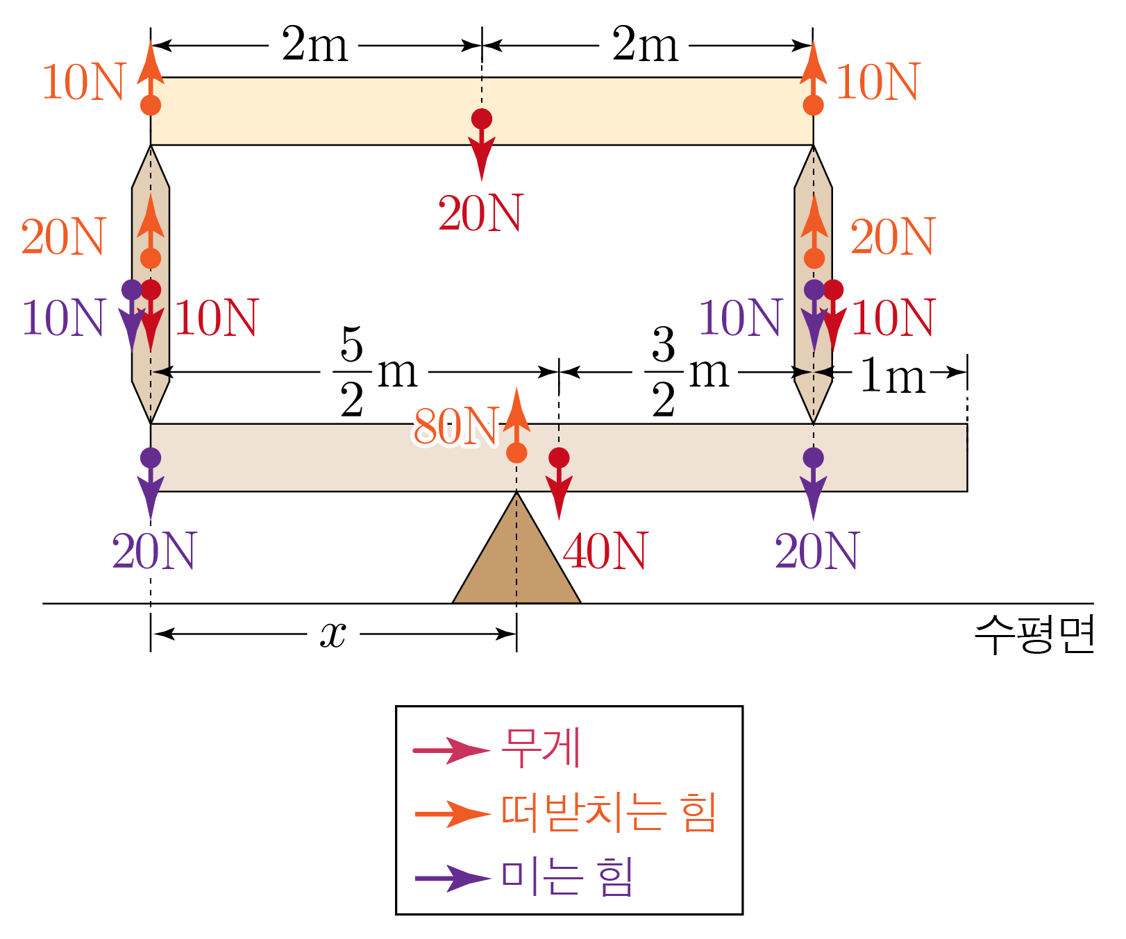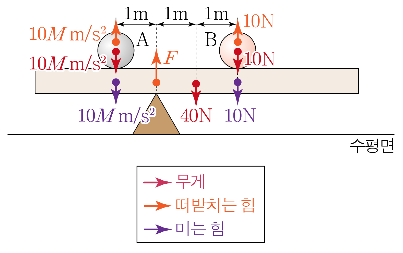 막대에 작용하는 F 알짜 = 0 F_{\text{알짜}} = 0F 알짜 = 0 이므로 받침대가 막대를 떠받치는 힘의 크기는 계의 무게와 같은데,