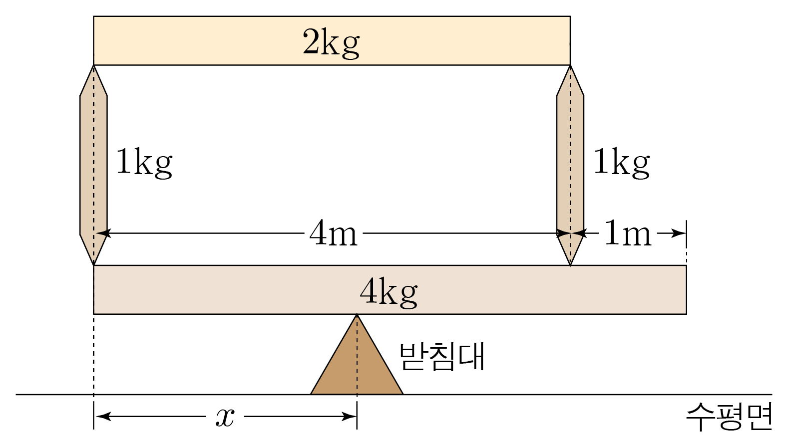 수평으로 놓인 위쪽 막대와 아래쪽 막대의 길이가 각각 4 m 4\,\mathrm{m}4 m , 5 m 5\,\mathrm{m}5 m 일 때, x xx 는? (단, 중력 가속도는 10 m / s 2 10\,\mathrm{m/s^2}1 0 m / s 2 이고, 막대의 밀도는 균일하며, 막대의 두께와 폭은 무시한다.)
