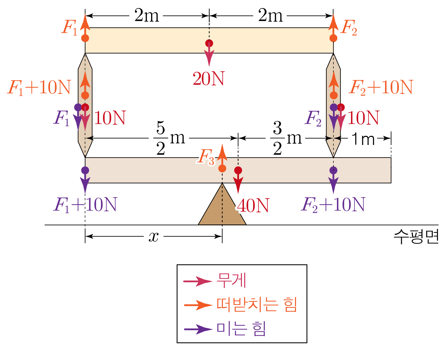 왼쪽과 오른쪽 기둥이 아래쪽 막대를 누르는 힘의 크기는 각각 F 1 + 10 N F_1 + 10\,\mathrm{N}F 1 + 1 0 N , F 2 + 10 N F_2 + 10\,\mathrm{N}F 2 + 1 0 N 이다.