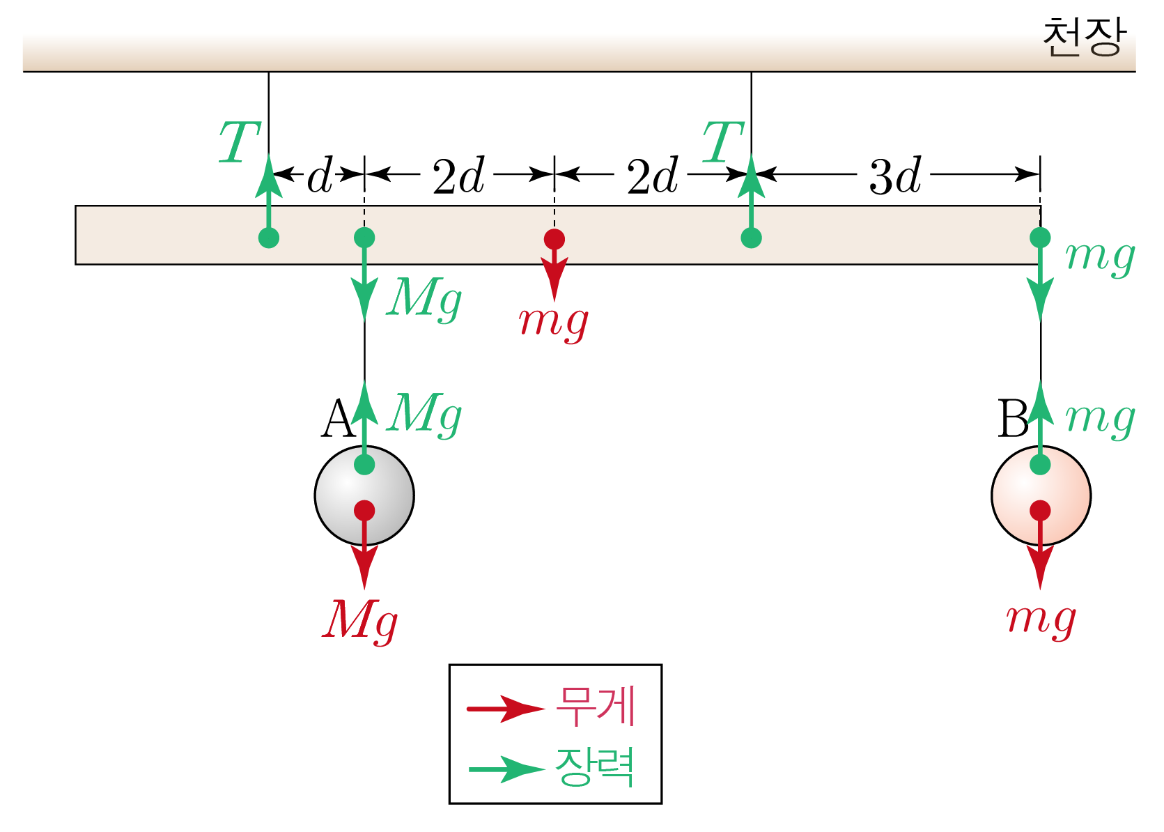 2 T = M g + 2 m g 2T = Mg + 2mg2 T = M g + 2 m g ⋯①이다.