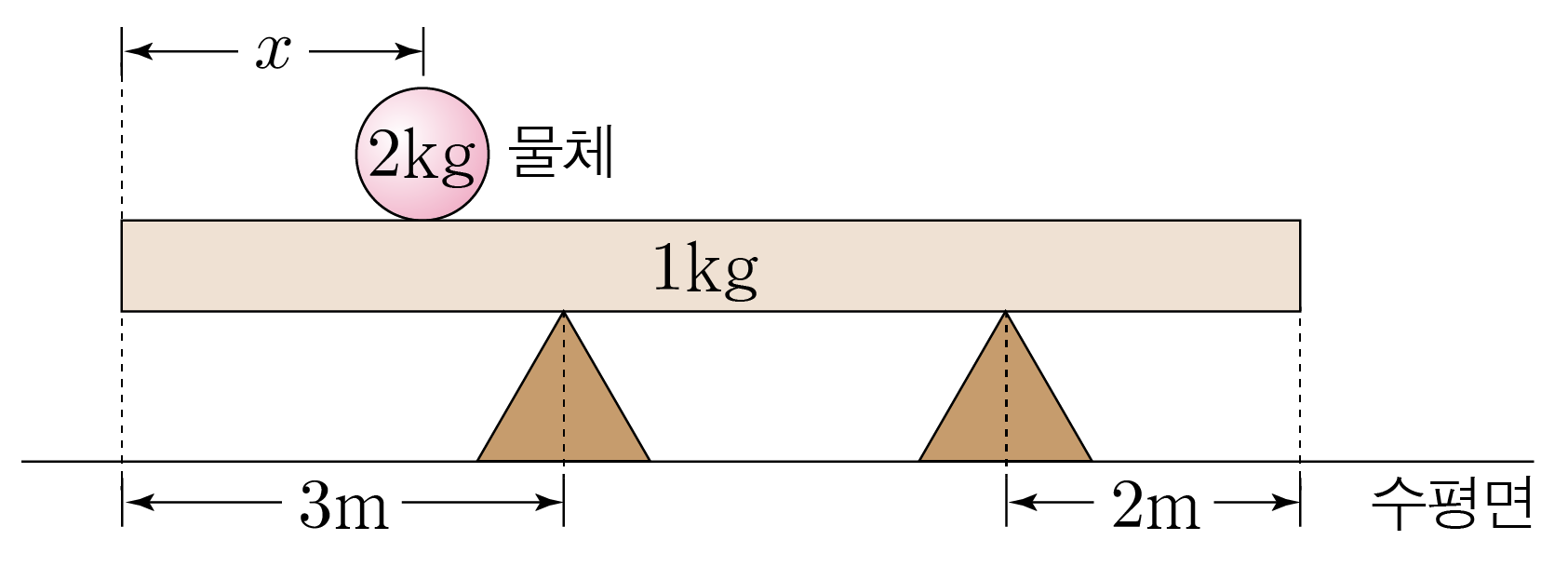 막대의 왼쪽 끝과 물체 사이의 거리는 x xx 이다. 막대가 평형을 유지할 때, x xx 의 최댓값과 최솟값을 구해보자. (단, 중력 가속도는 10 m / s 2 10\,\mathrm{m/s^2}1 0 m / s 2 이고, 막대의 밀도는 균일하며, 막대의 두께와 폭, 물체의 크기는 무시한다.)