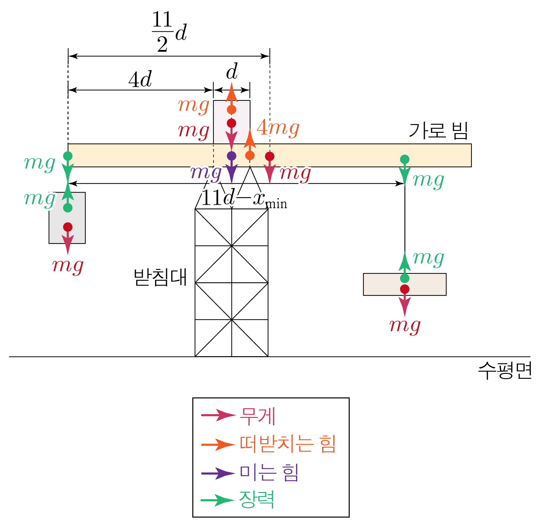 그러므로 x xx 의 최소값을 x min x_{\min}x m i n 이라 할 때, 가로 빔과 물체에 작용하는 모든 힘을 표기하면 아래 그림과 같다.