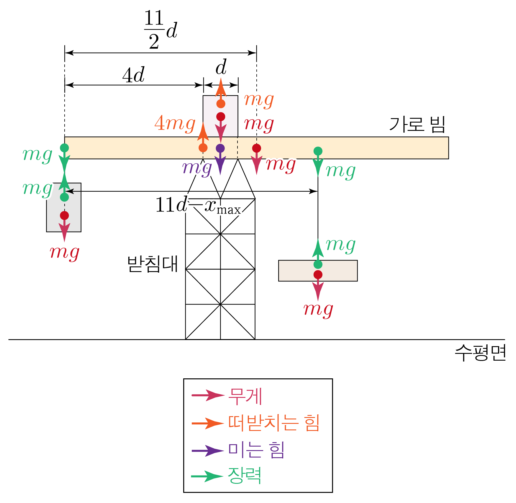 그러므로 x xx 의 최댓값을 x max x_{\max}x m a x 라 할 때, 가로 빔과 물체에 작용하는 모든 힘을 표기하면 아래 그림과 같다.