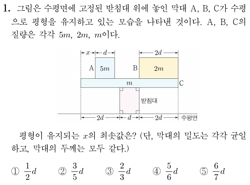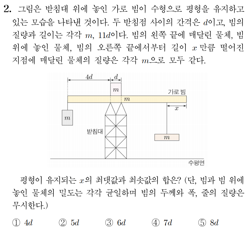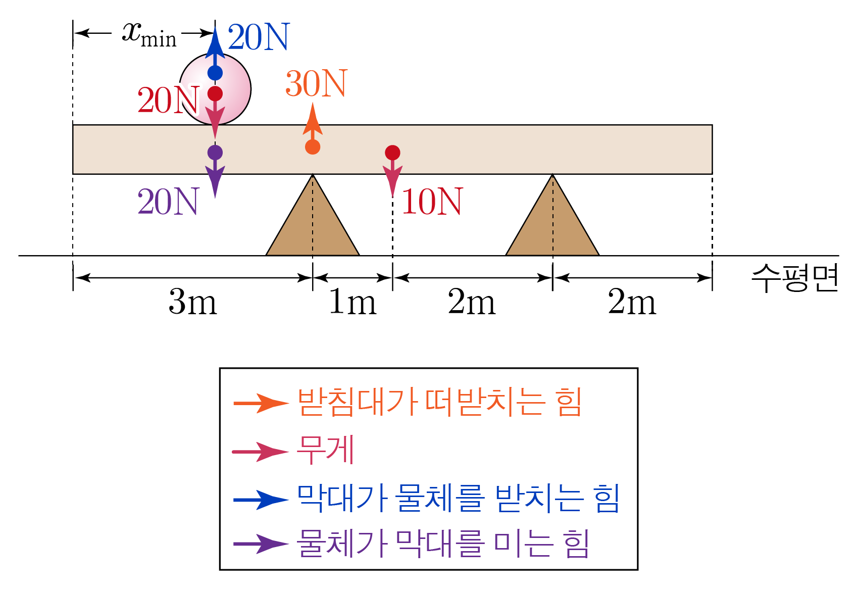 x xx 가 최솟값일 때, 두 받침대 중 왼쪽 받침대만 막대를 떠받치므로 막대와 물체를 하나의 계로 볼 때,