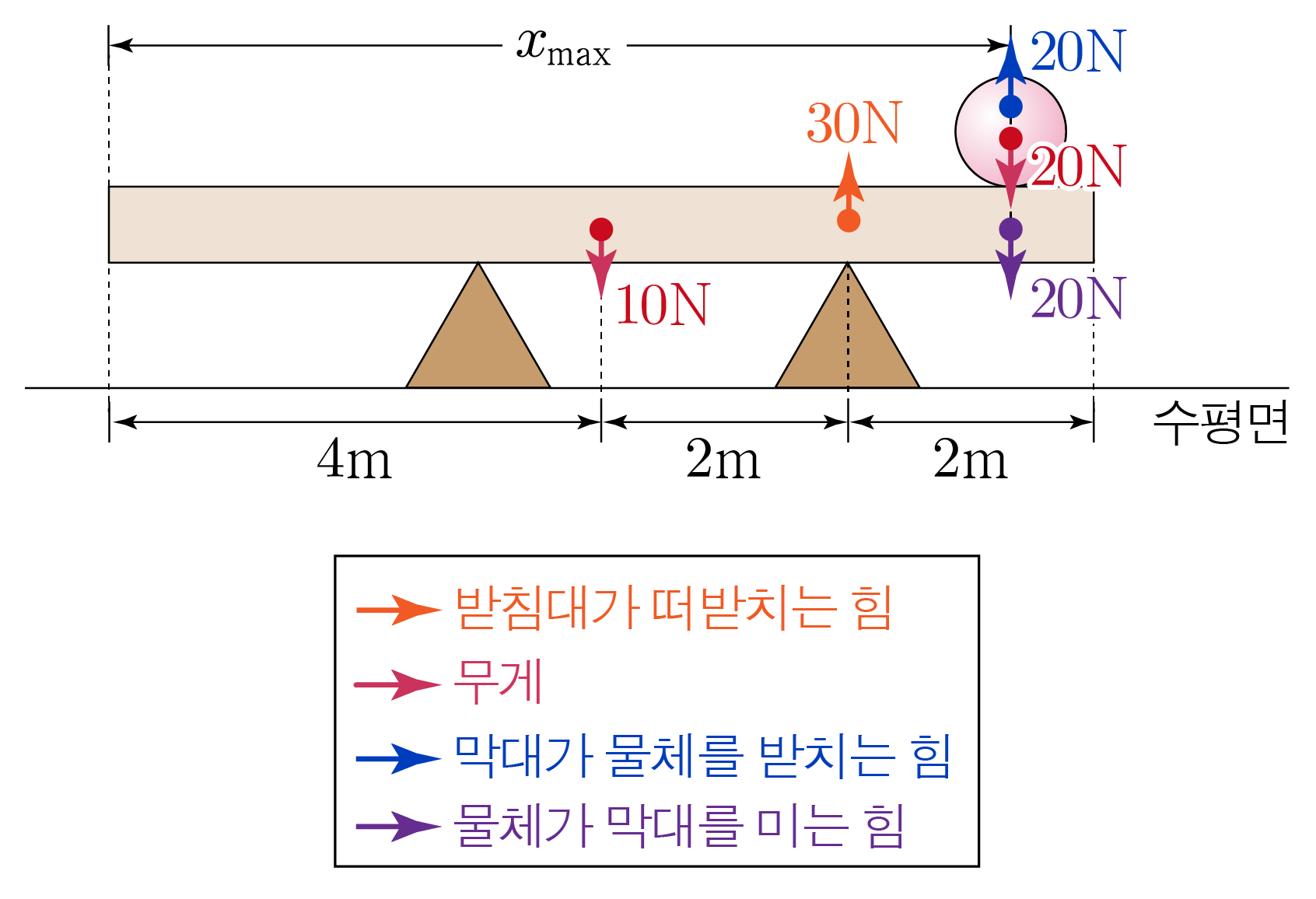 x xx 가 최댓값일 때, 받침대의 왼쪽 지점만 가로 빔을 떠받치므로, 가로 빔과 물체를 하나의 계로 볼 때, 계의 질량 중심의 위치는 받침대의 왼쪽 지점과 같다.