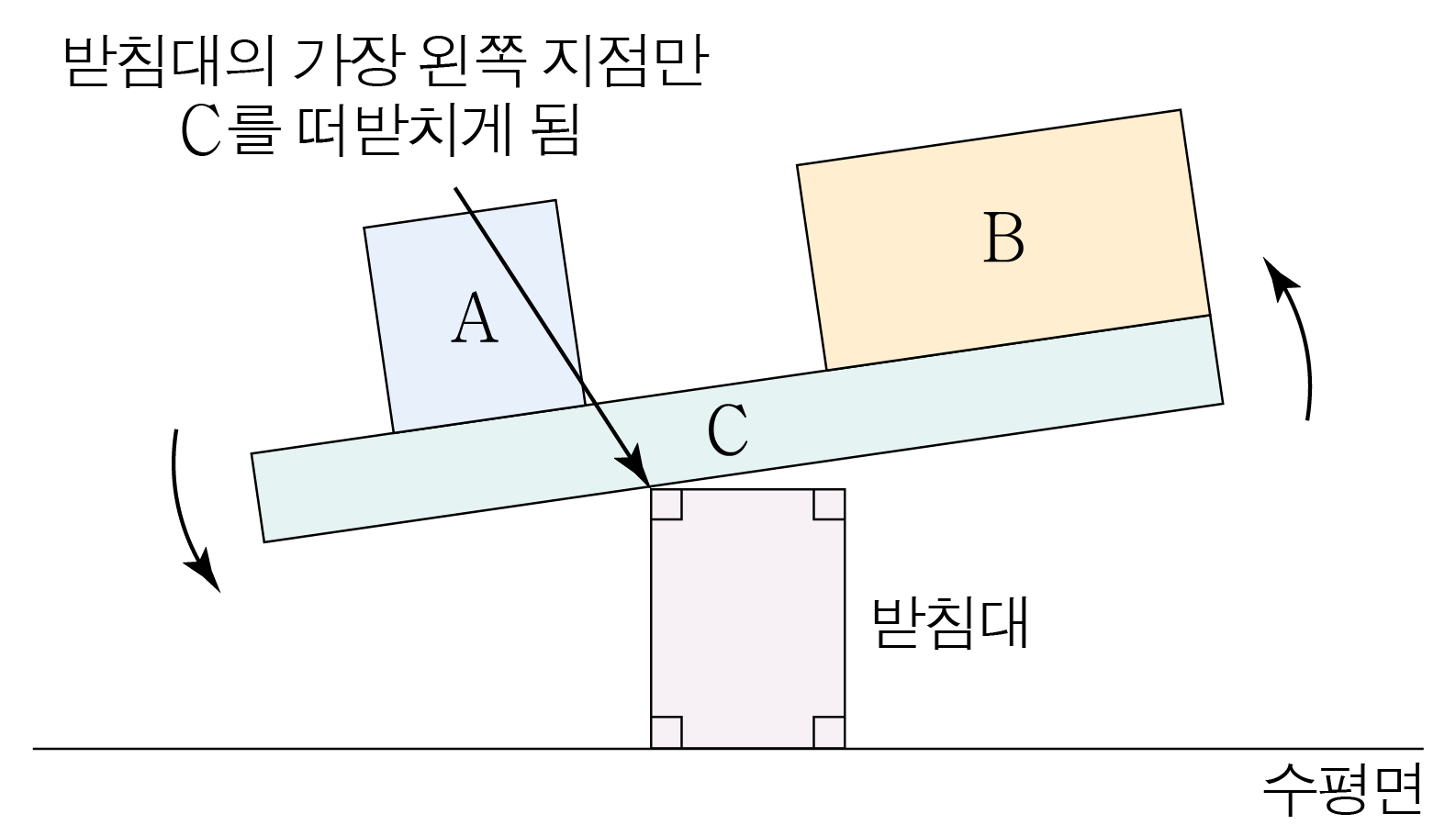 A , B , C \mathrm{A}, \mathrm{B}, \mathrm{C}A , B , C 를 하나의 계로 볼 때, 계의 질량 중심이 받침대의 가장 왼쪽 지점보다 왼쪽으로 치우치면