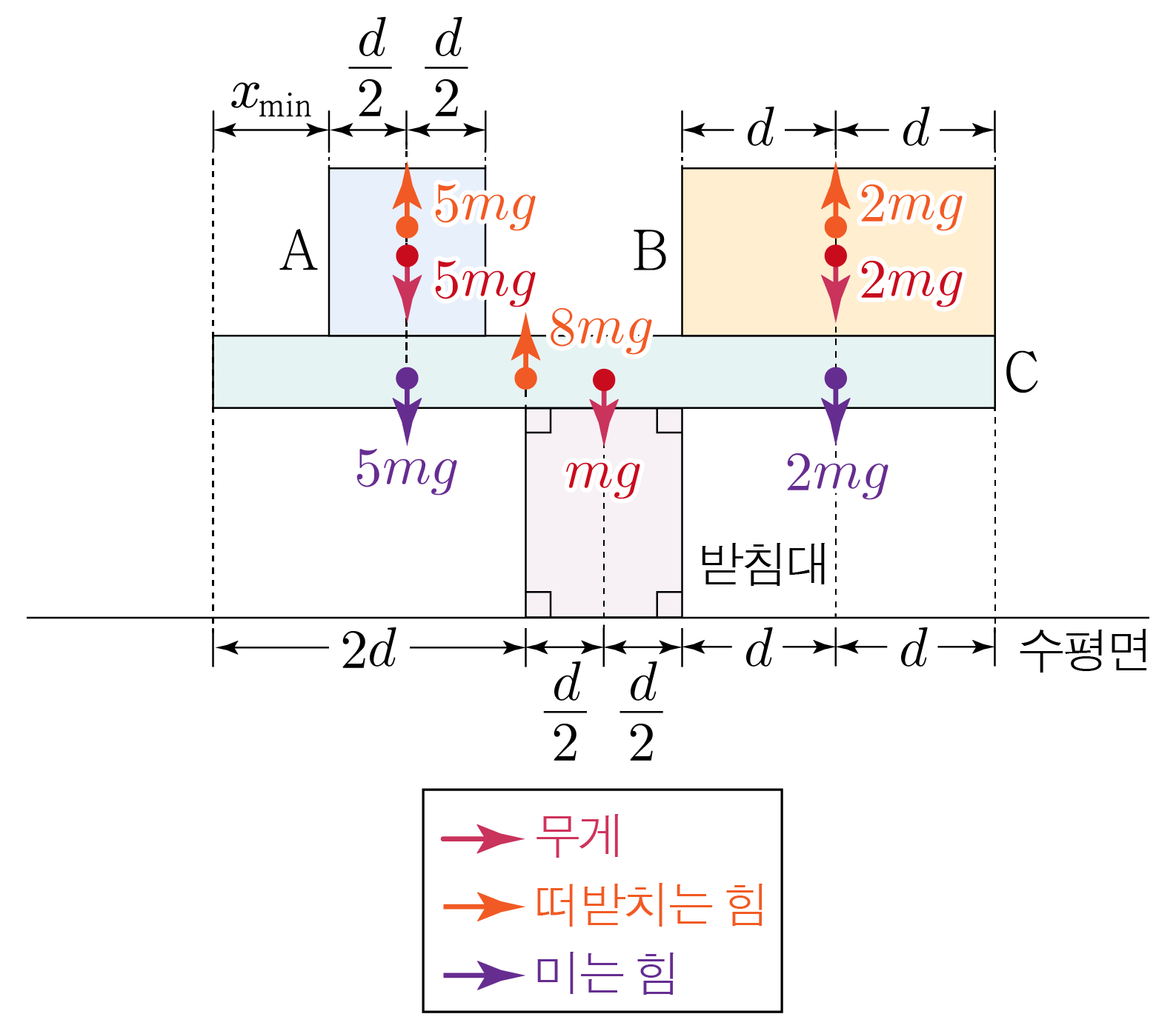 x xx 가 최소값일 때, 받침대의 가장 왼쪽 지점만 C \mathrm{C}C 를 떠받치므로,