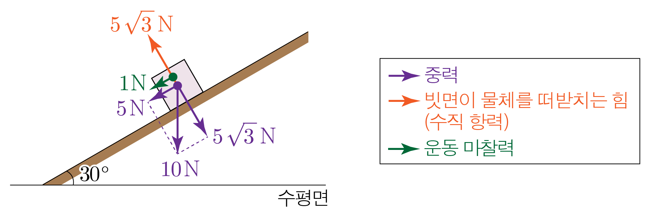 ①에 의해 물체에 작용하는 알짜힘은 빗면에 나란한 방향으로 분해한 중력과 마찰력의 합과 같으므로