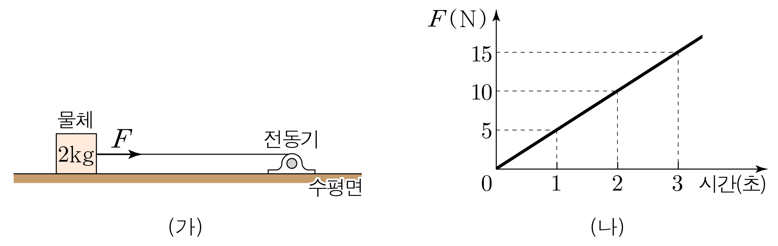 그림 (나)는 전동기가 수평 방향으로 당기는 힘 F → \overrightarrow{F}F 의 크기를 시간에 따라 나타낸 것이다.