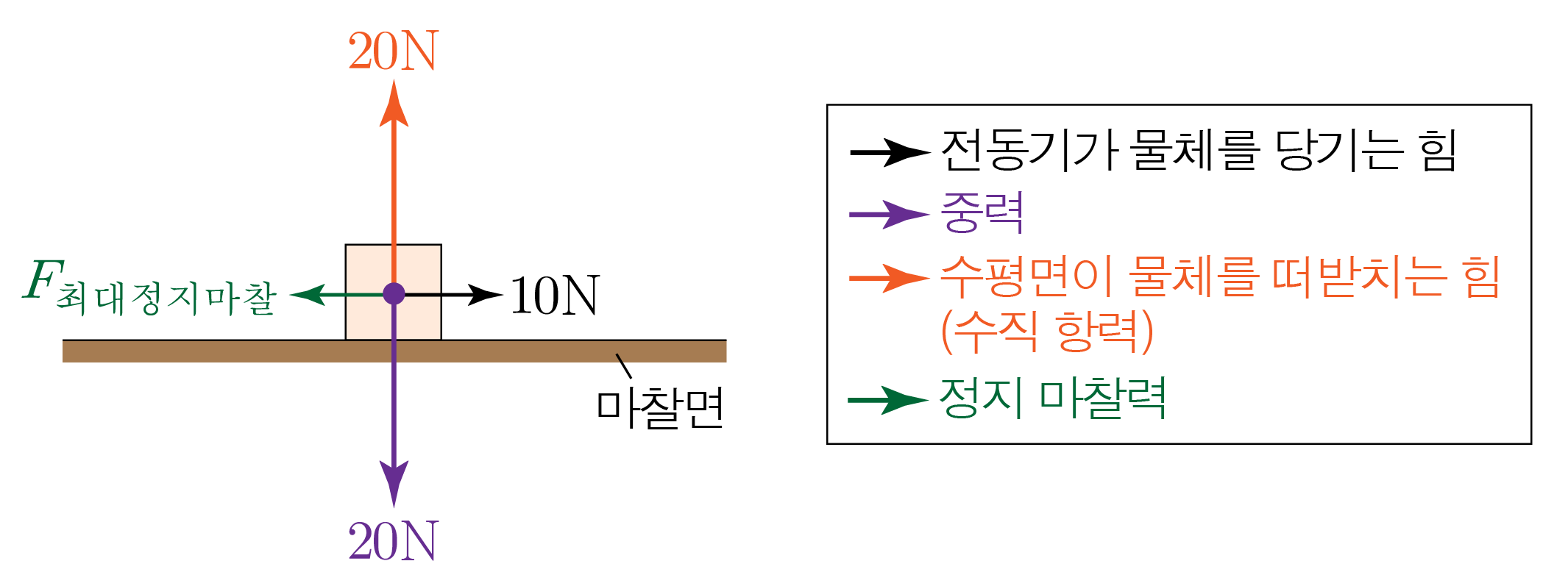 10 N = μ 정지 × 20 N , 10\,\mathrm{N}=\mu_{\mathrm{정지}}\times20\,\mathrm{N},1 0 N = μ 정 지 × 2 0 N ,