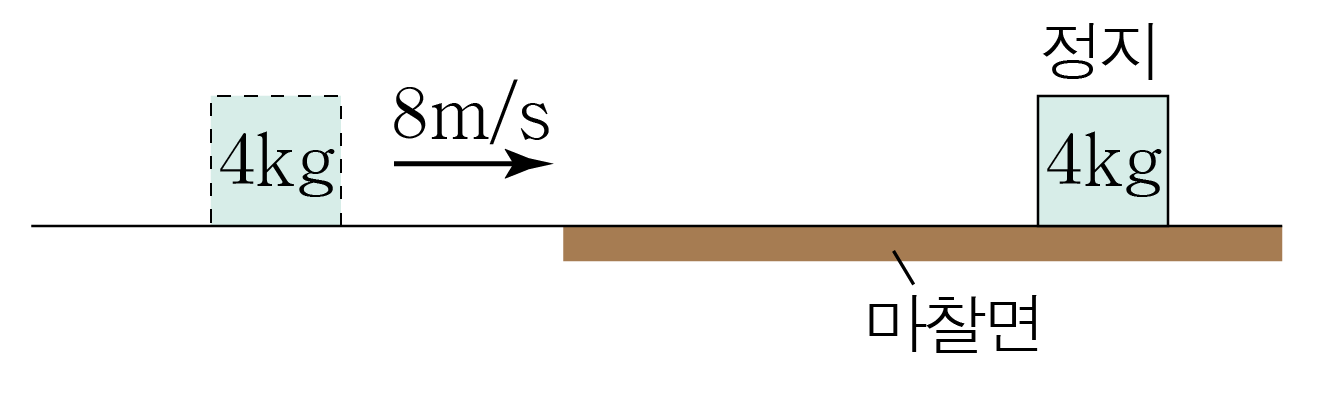그림과 같이 질량이 4 k g 4\,\mathrm{kg}4 k g 인 물체가 마찰이 없는 수평면에서 8 m / s 8\,\mathrm{m/s}8 m / s 의 속력으로 등속도 운동을 하다가 마찰 구간에 진입한 순간부터 2 s 2\,\mathrm{s}2 s 가 지난 후 정지한다.