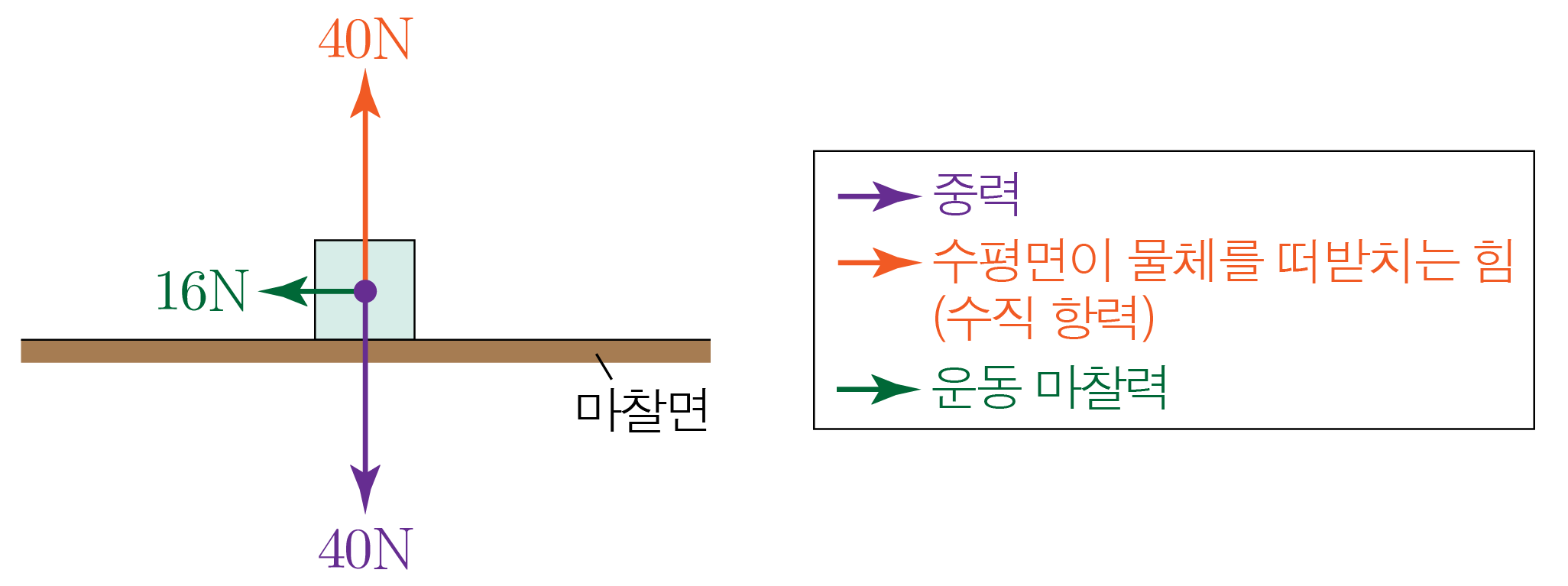 이때 물체의 질량은 4 k g 4\,\mathrm{kg}4 k g 이므로 물체에 작용하는 중력은 4 k g × 10 m / s 2 = 40 k g ⋅ m / s 2 = 40 N 4\,\mathrm{kg}\times10\,\mathrm{m/s^2}=40\,\mathrm{kg·m/s^2}=40\,\mathrm{N}4 k g × 1 0 m / s 2 = 4 0 k g ⋅ m / s 2 = 4 0 N 인데, 이는 수직 항력에 의해 모두 상쇄되므로 수직 항력의 크기는 40 N 40\,\mathrm{N}4 0 N 이다.