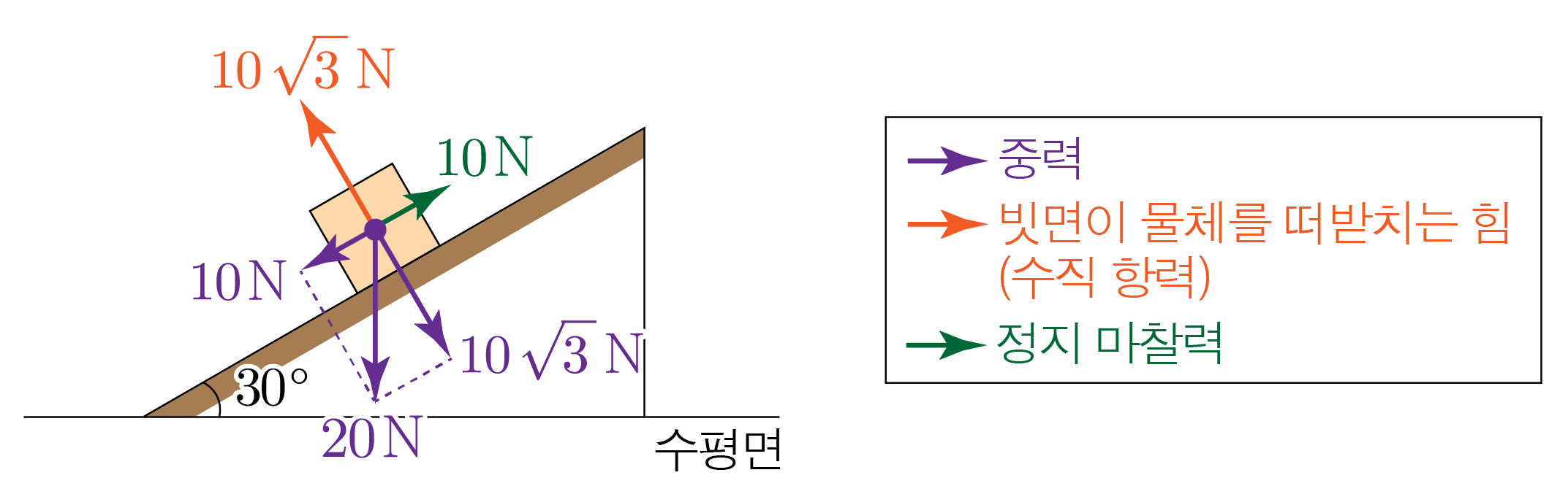 물체는 정지해 있으므로 빗면에 나란한 방향으로 분해한 힘의 크기는 정지 마찰력의 크기와 같다.