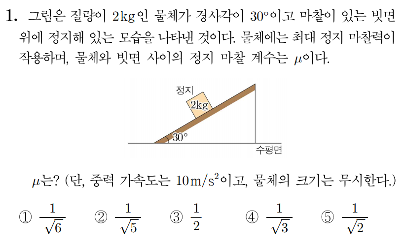10 N = μ 정지 × 10 3 N , 10\,\mathrm{N}=\mu_{\mathrm{정지}}\times10\sqrt{3}\,\mathrm{N},1 0 N = μ 정 지 × 1 0 3 N ,