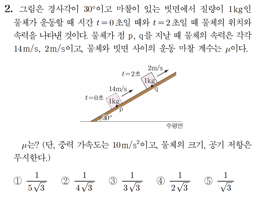 물체와 마찰면 사이의 운동 마찰 계수는 μ \muμ 일 때, μ \muμ 를 구해보자. (단, 중력 가속도는 10 m / s 2 10\,\mathrm{m/s^2}1 0 m / s 2 이고, 공기 저항과 물체의 크기는 무시한다.)