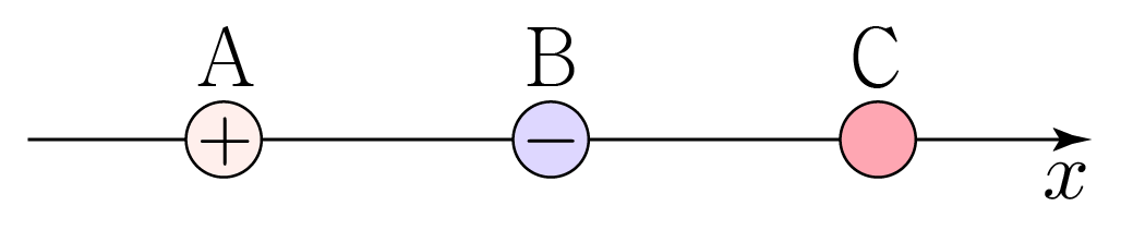 그림과 같이 x xx 축 상에 점전하 A \mathrm{A}A , B \mathrm{B}B , C \mathrm{C}C 가 같은 거리만큼 떨어져 고정되어 있다.