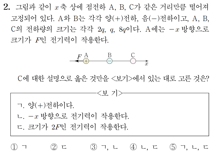 C \mathrm{C}C 에 작용하는 전기력의 부호는 음(− -− )이므로 C \mathrm{C}C 에는 − x -x− x 방향으로 전기력이 작용한다. (O)