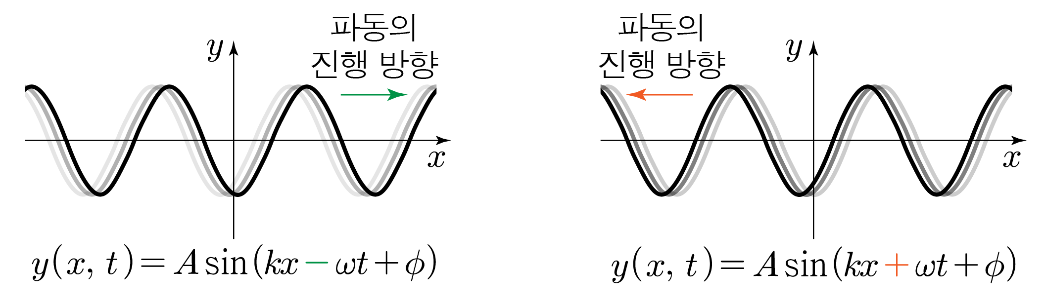 - +x 방향으로 진행하는 경우: y(x,t)=Asin(kx−ωt+ϕ)