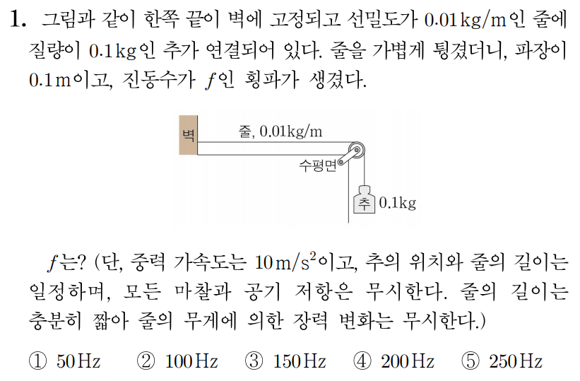 어느 줄의 질량이 1kg이고, 길이가 100m일 때, 선밀도 μ를 구해보자.