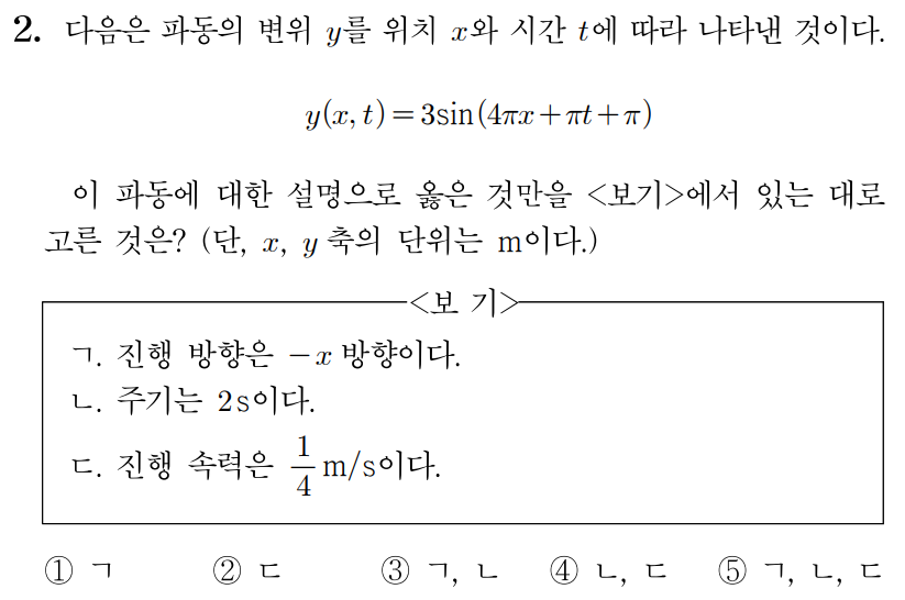 ㄱ. y(x,t)=3sin(4πx+πt+π)에서 πt는 양(+)의 부호를 가지므로 파동의 진행 방향은 −x 방향이다. (O)