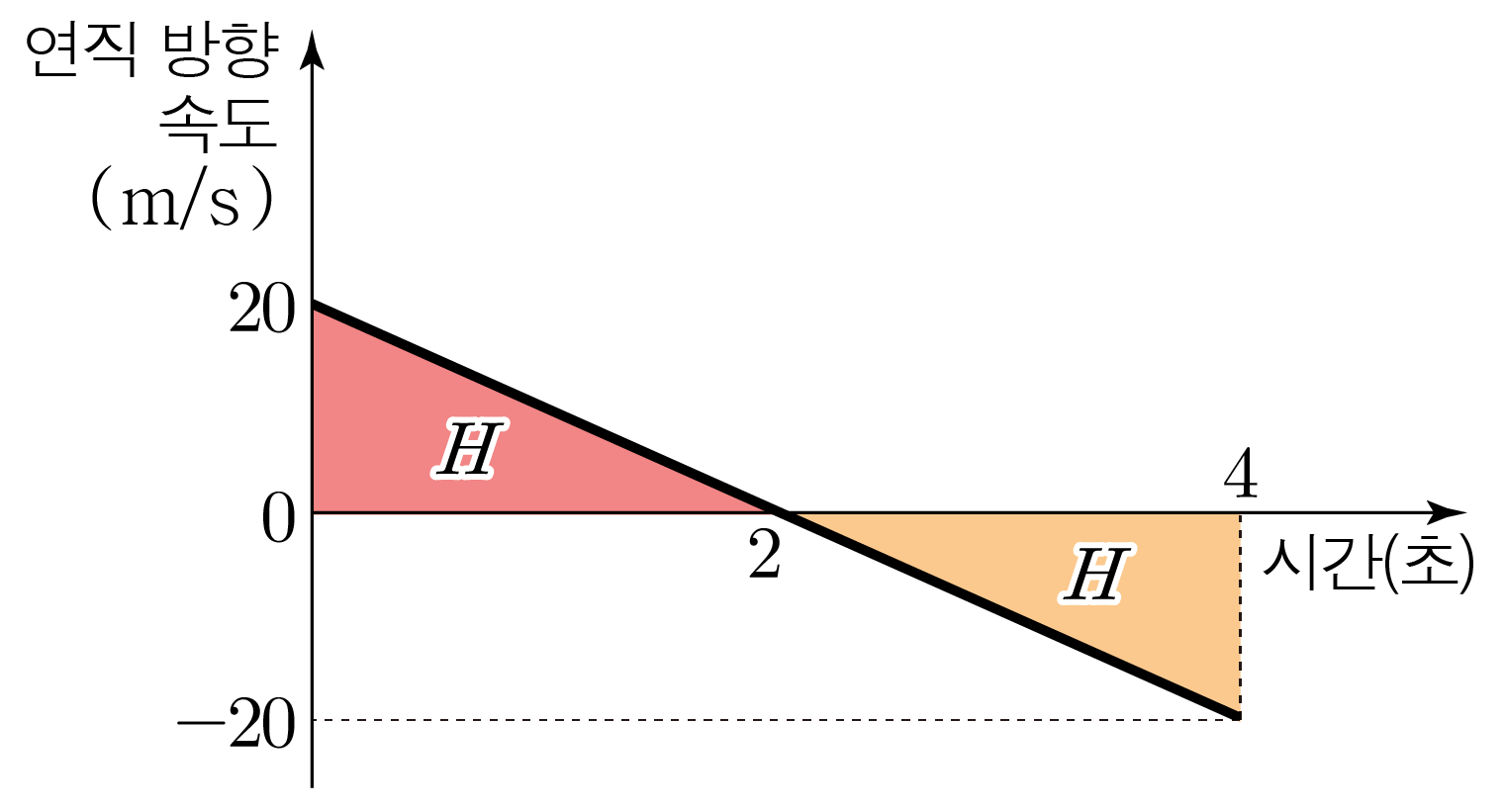 최고점의 높이 H는 분홍색 또는 주황색으로 칠한 면적에 해당하므로 H=21×20m/s×2s, H=10m/s×2s, H=20m이다.