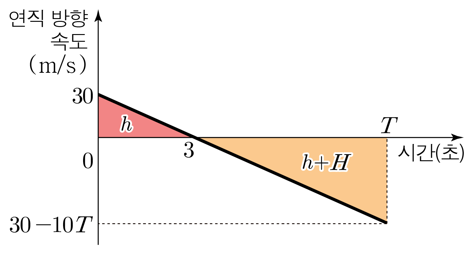 이 식에 앞서 구한 h=45m,T=9를 넣으면 h+H=21×∣30m/s−10Tm/s∣×(Ts−3s)에서 45m+H=21×∣30m/s−10×9m/s∣×(9s−3s), 45m+H=21×∣30m/s−90m/s∣×6s, 45m+H=21×∣−60m/s∣×6s, 45m+H=21×60m/s×6s, 45m+H=30m/s×6s, 45m+H=180m, H=135m이다.