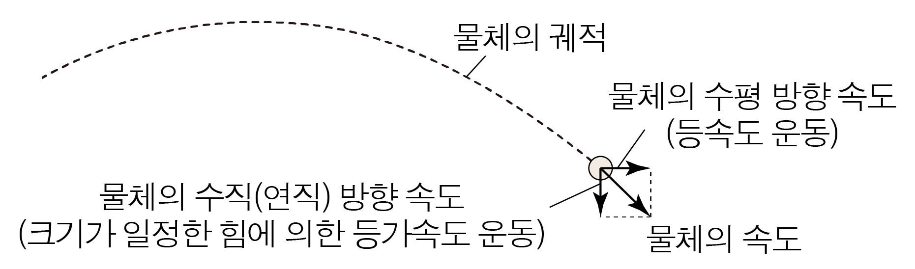 물체가 던져진 순간, 속도를 수평 방향과 연직 방향으로 분해하면 아래 그림과 같다.
