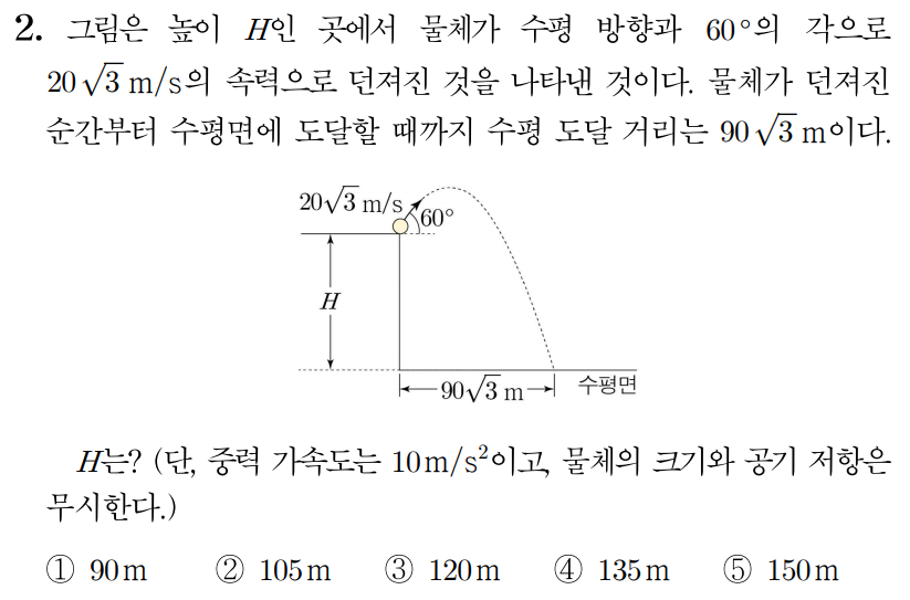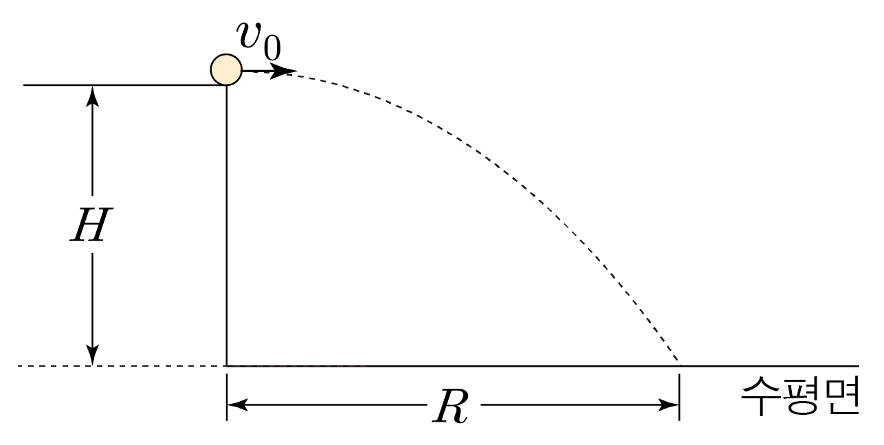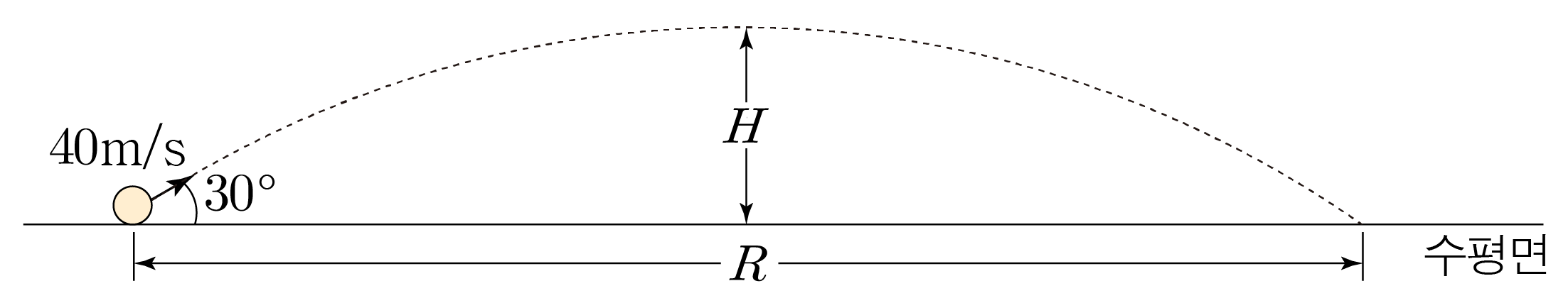 물체의 최고점의 높이 H와 물체가 던져진 순간부터 수평면에 도달할 때까지 이동한 수평 거리 R을 구해보자. (단, 중력 가속도는 10m/s2이고, 물체의 크기와 공기 저항은 무시한다.)