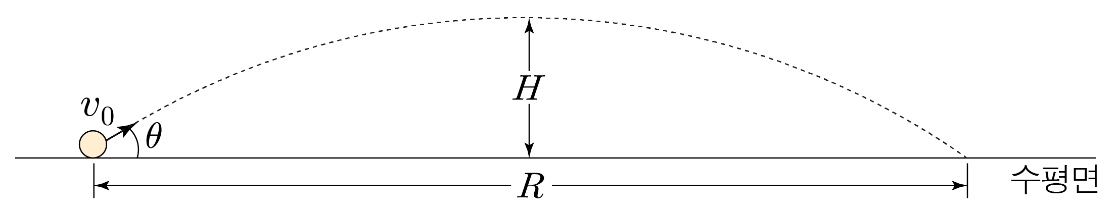 물체는 던져진 순간부터 g2v0sinθ동안 운동하여 수평면에 도달하고, 물체는 수평 방향으로 속력 v0cosθ인 등속도 운동을 하므로 이 동안 물체가 수평 방향으로 이동한 거리 R=v0cosθ×g2v0sinθ, R=g2v02sinθcosθ이다.