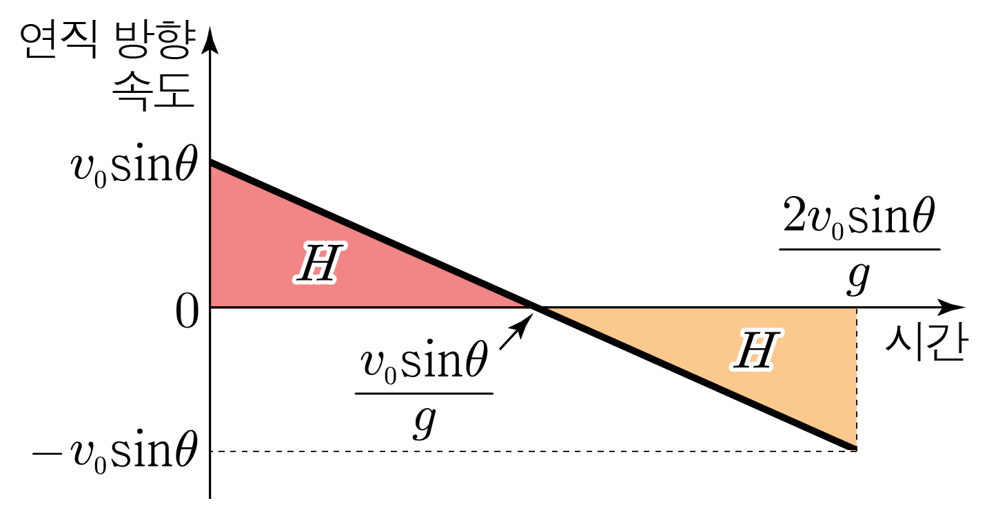 최고점의 높이 H는 분홍색 또는 주황색으로 칠한 면적에 해당하므로 H=21×v0sinθ×gv0sinθ, H=2gv02(sinθ)2이다.