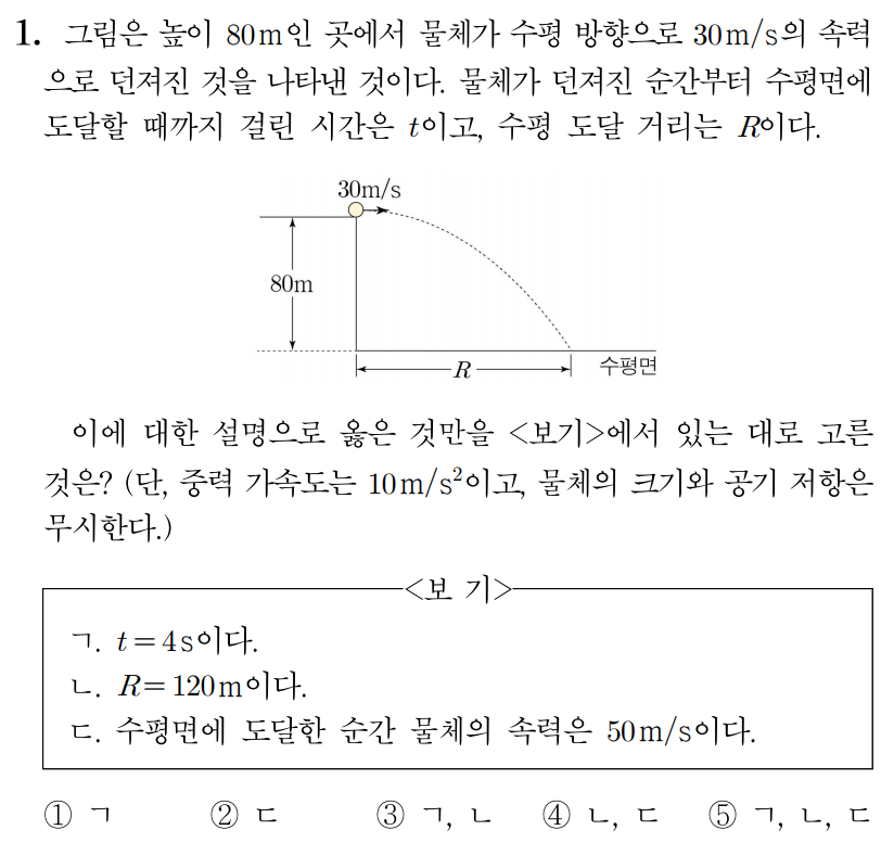 ㄴ. 물체는 수평 방향으로 속력 30m/s인 등속도 운동을 하므로 R=30m/s×4s, R=120m이다. (O)