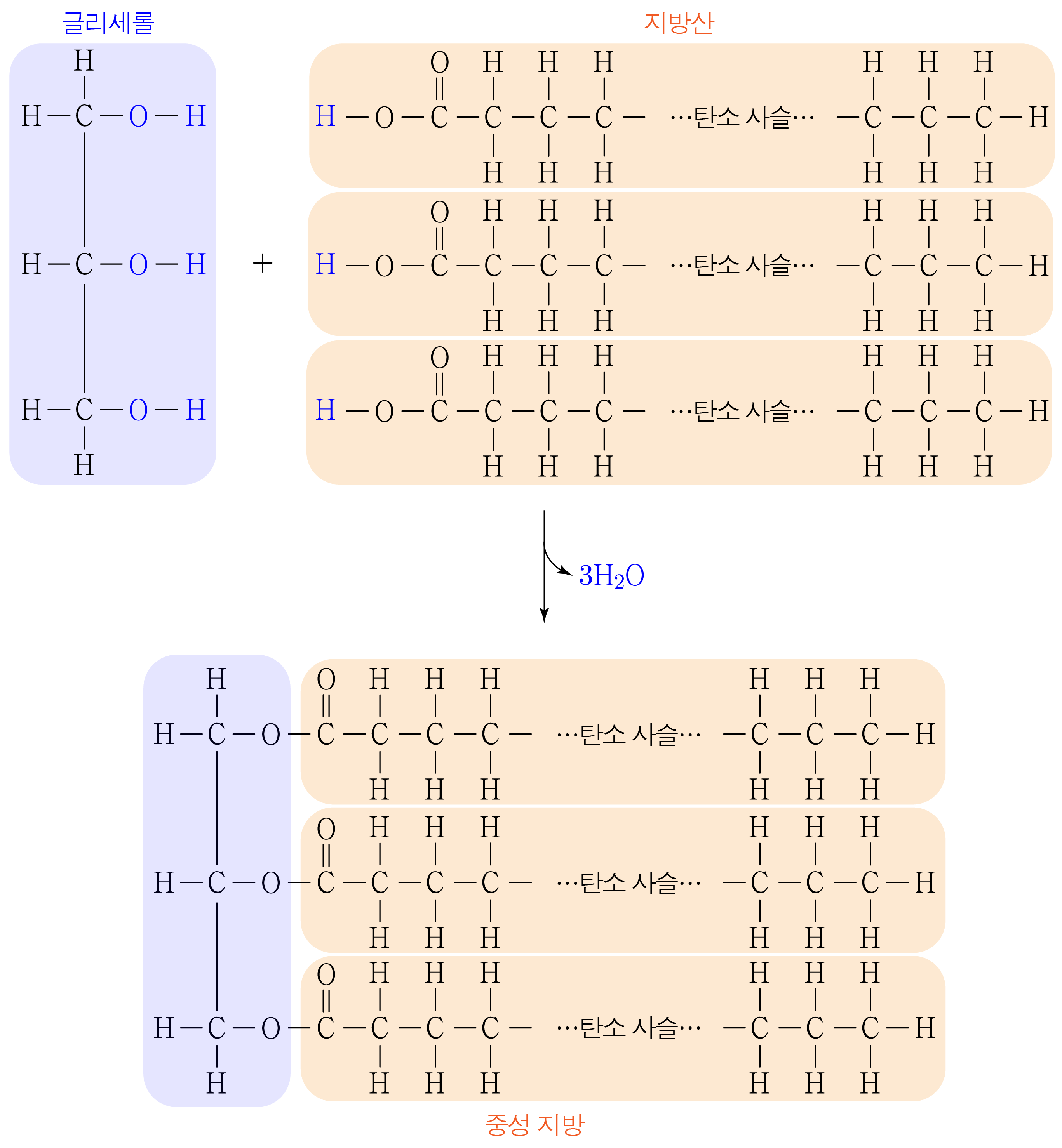탄소 개가 일직선으로 연결된 글리세롤 개가 수십 개의 탄소가 연결된 지방산 개와 결합한 물질이다.