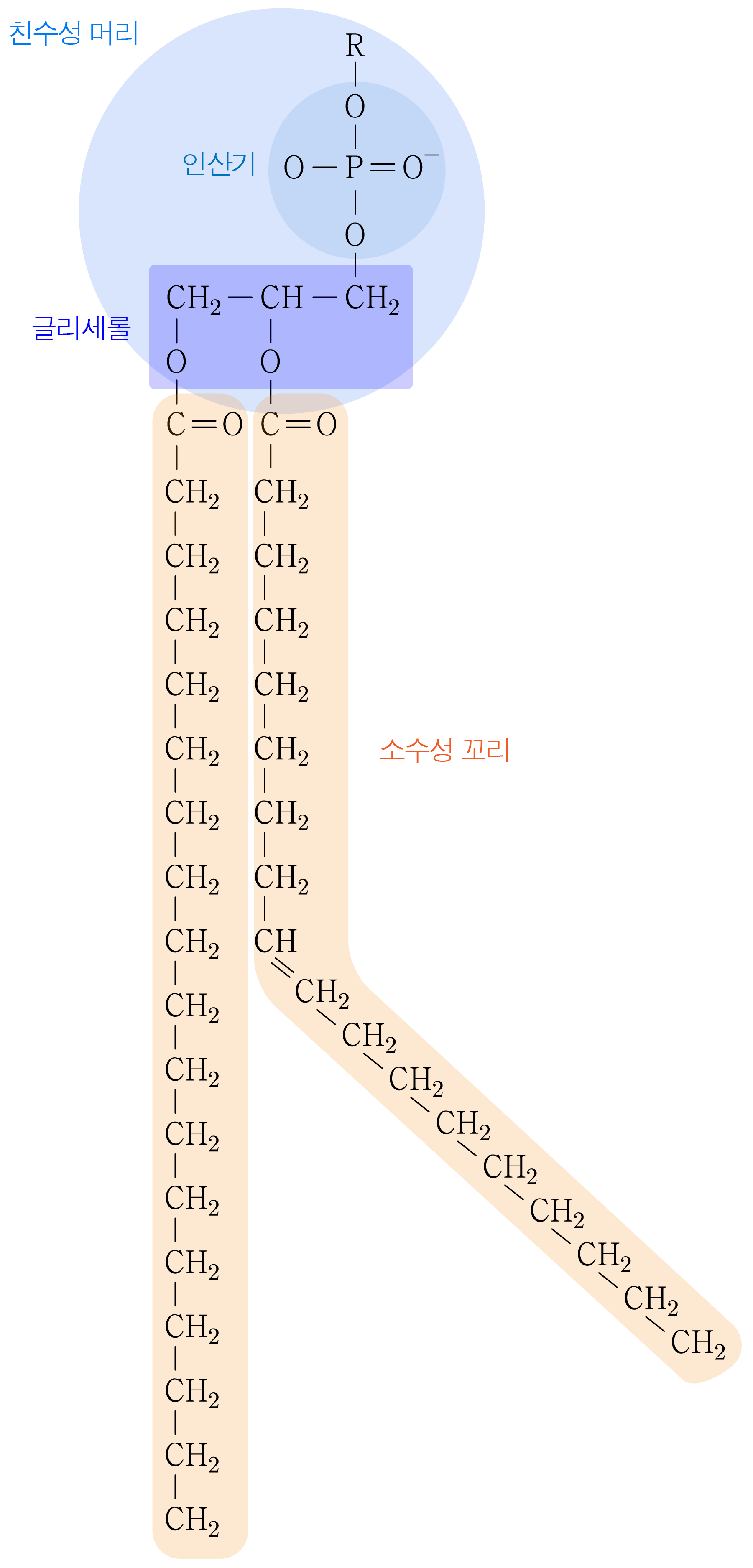 인산기 부분과 글리세롤을 포함하는 머리는 물을 좋아하는 성질인 친수성을 띠고,