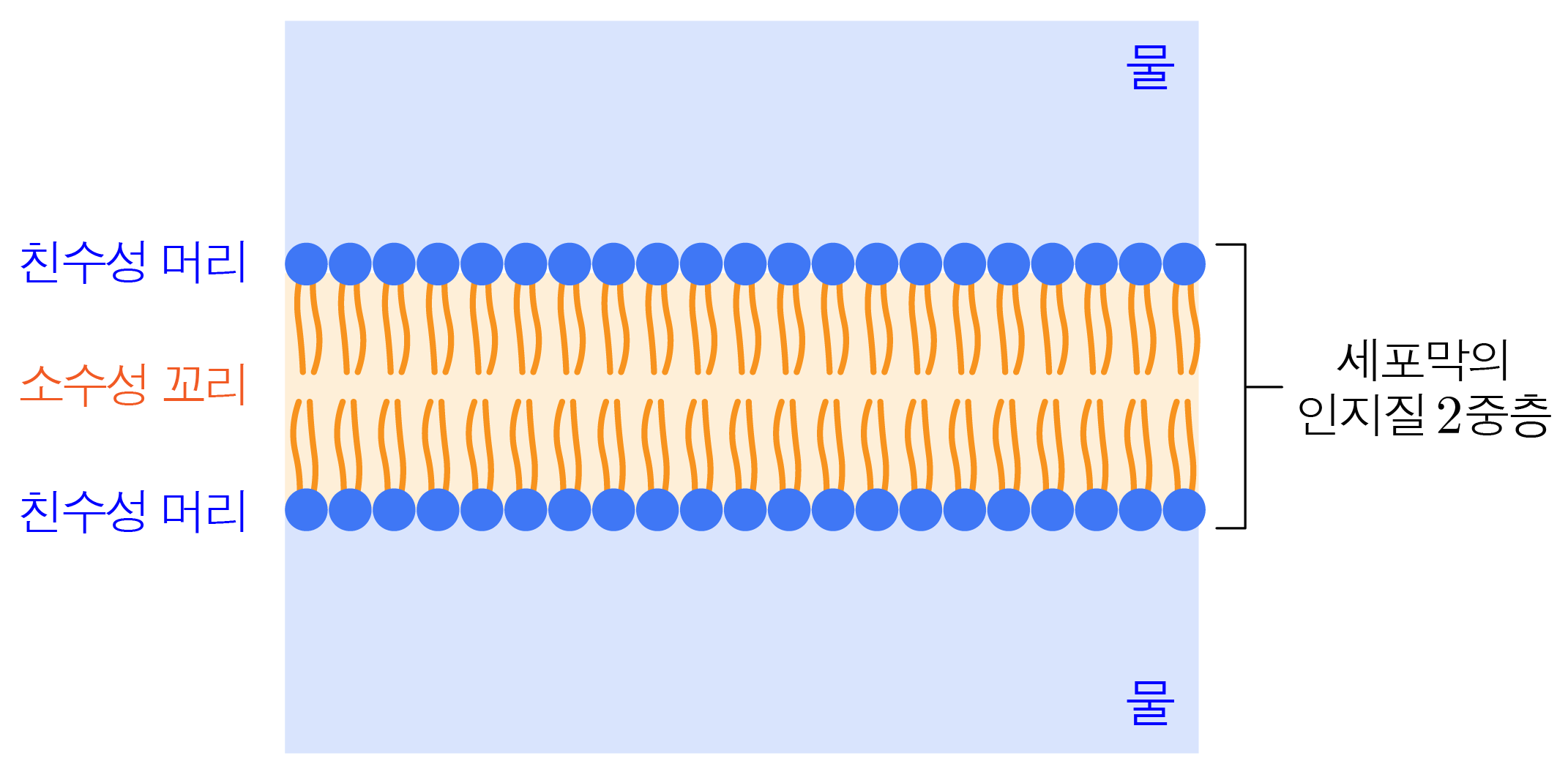 따라서 인지질을 물속에 넣으면 친수성인 머리는 물이 있는 쪽을, 지방산은 물이 없는 쪽을 향한다.