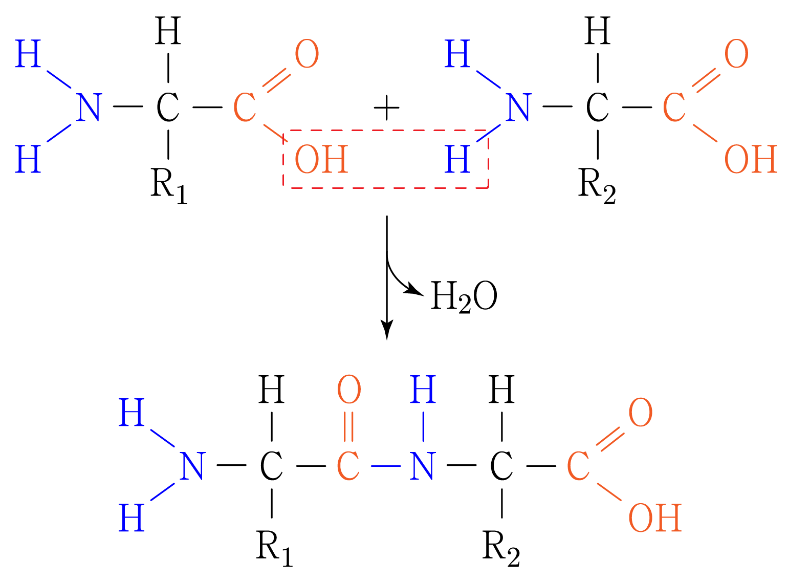 펩타이드 결합은 아래와 같이 한 아미노산의 아미노기가 다른 아미노산의 카복실기와 반응하여
