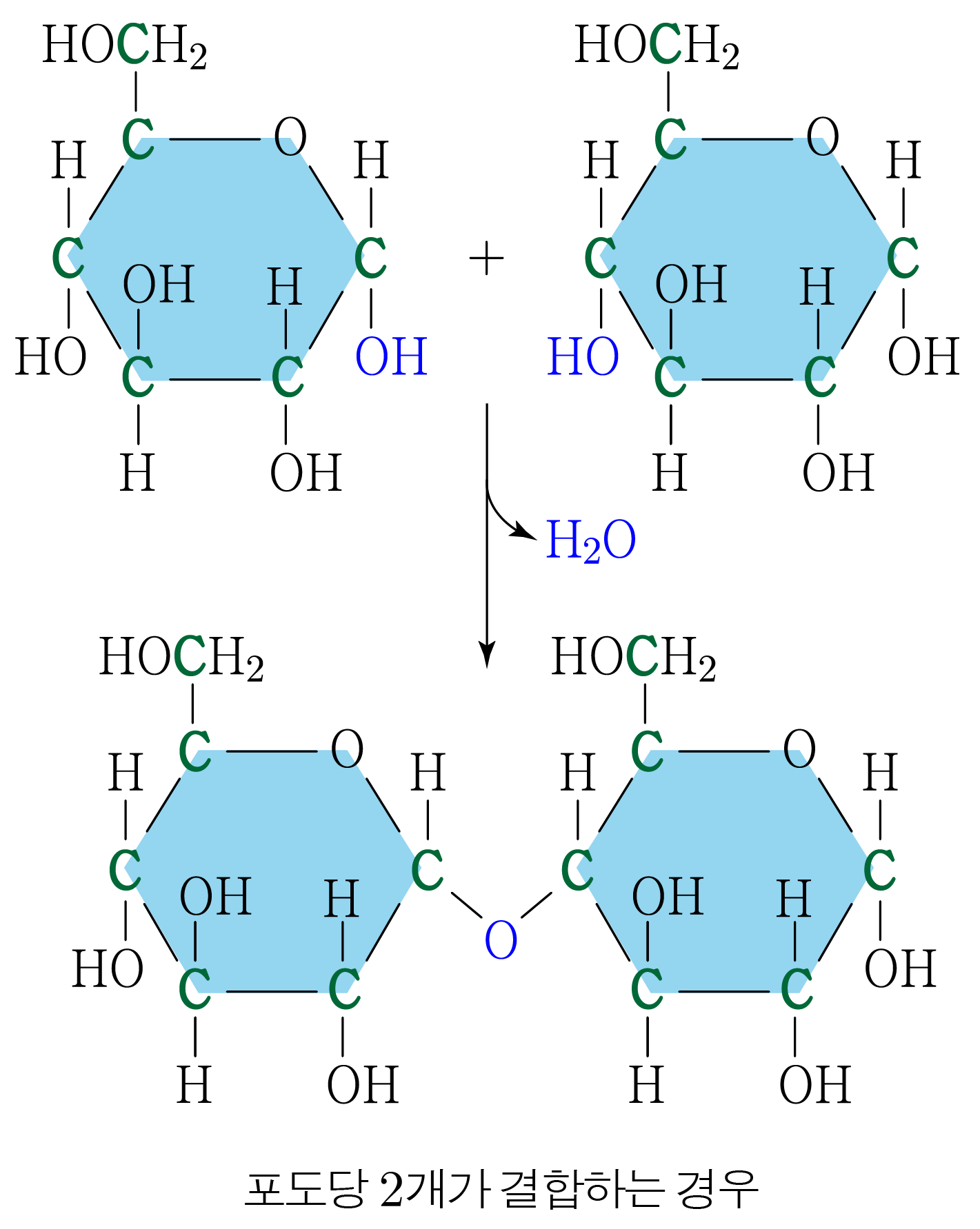 글리코시드 결합은 아래와 같이 각 당의 가 서로 반응하여 물 한 분자를 만들고 연결되는 결합이다.