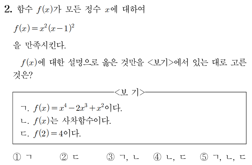 ㄴ. f(x)=x4−2x3+x2에서 변수 x의 지수 중 가장 큰 값은 4이므로 f(x)는 사차함수이다. (O)