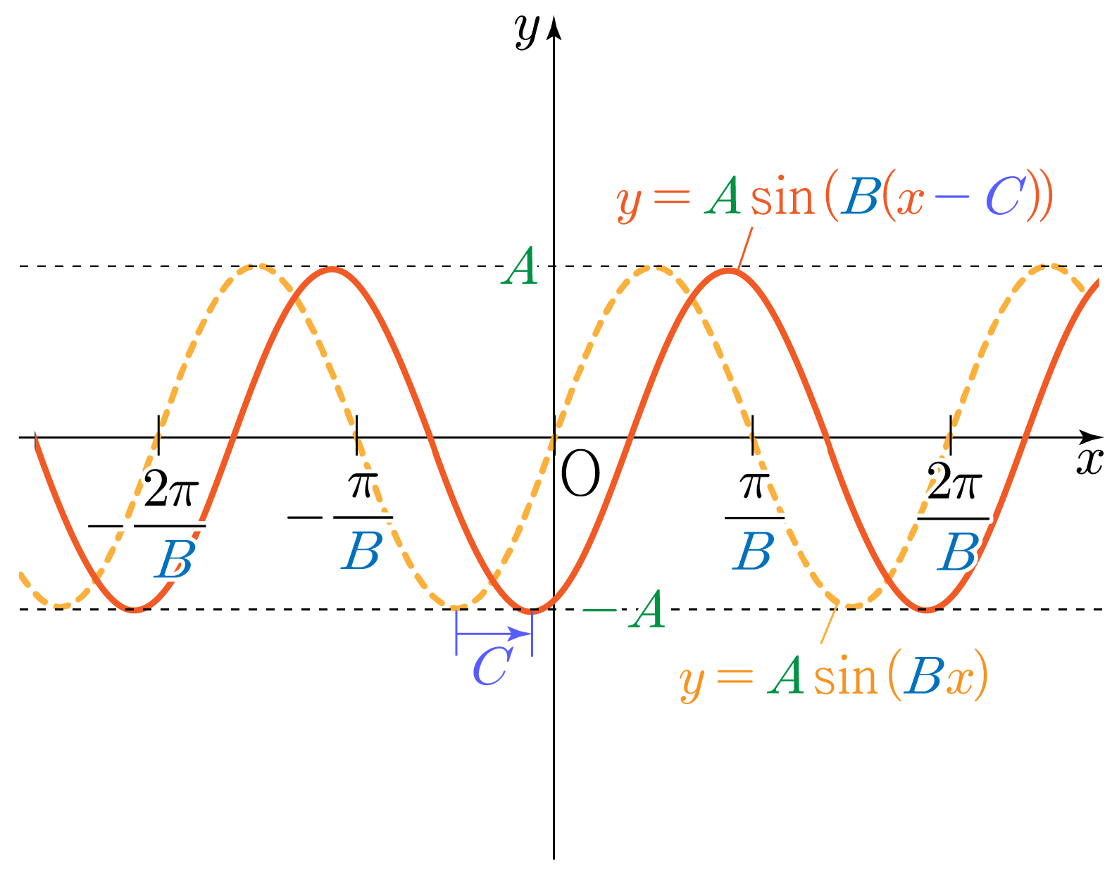 - y=Asin(Bx)의 그래프를 x축 방향으로 C만큼 움직인 형태이다.
