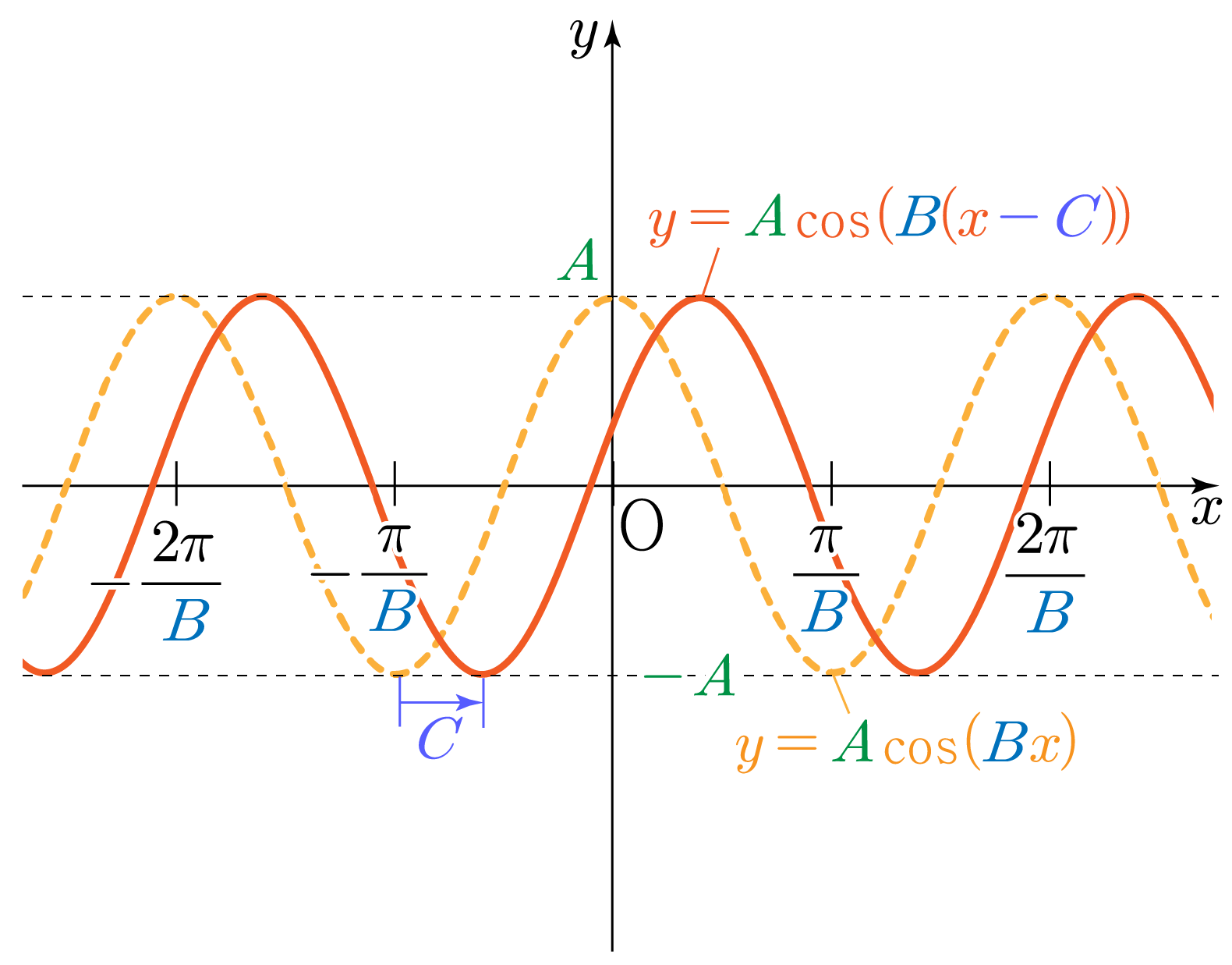 - y=Acos(Bx)의 그래프를 x축 방향으로 C만큼 움직인 형태이다.