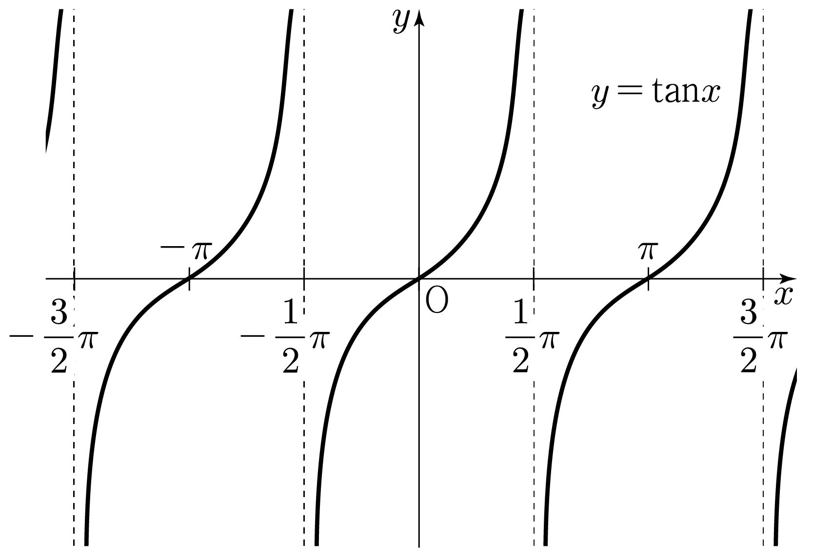 - y가 음의 무한대(−∞)나 양의 무한대(∞)로 가는 부분이 π를 주기로 반복된다.
