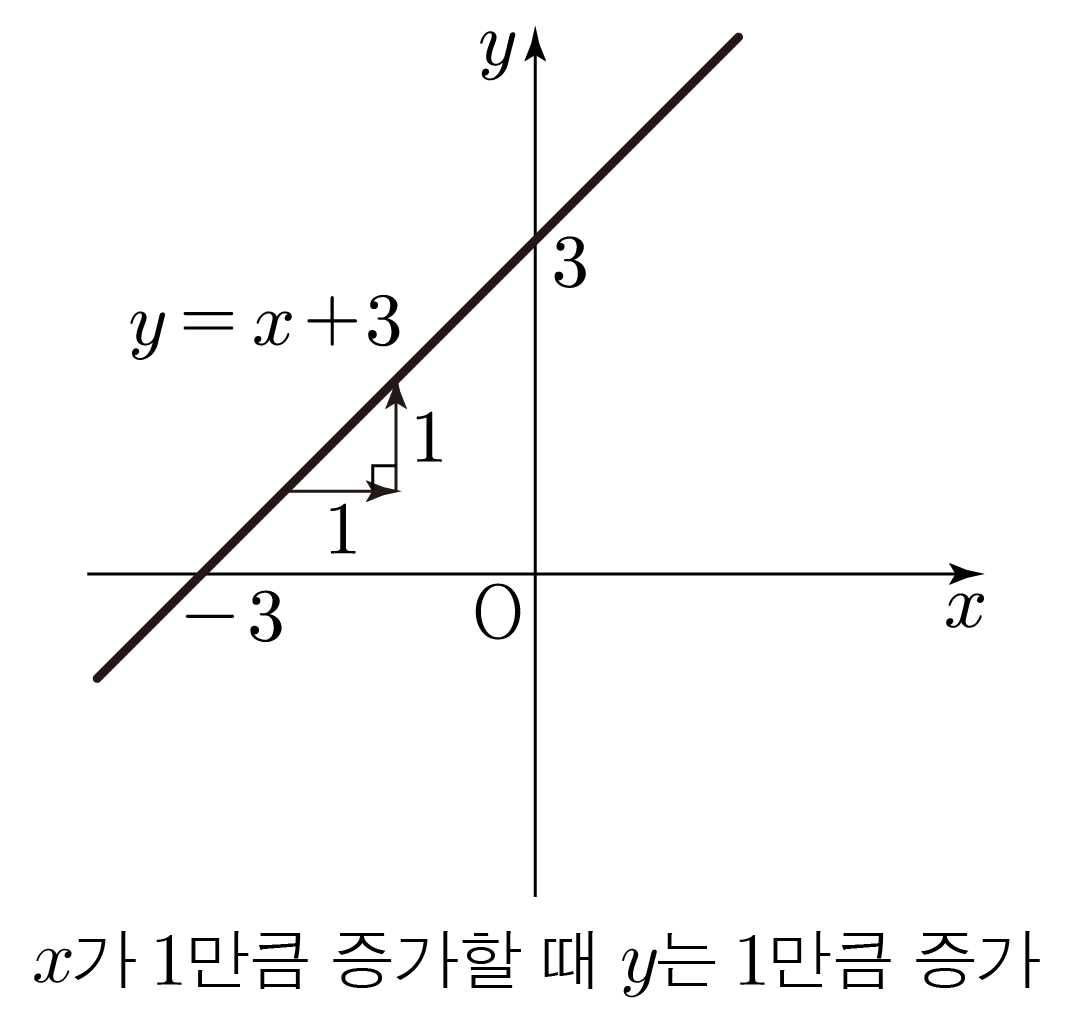 x=0일 때 y=3이므로 y 절편은 (0,3)이고, 기울기가 1이므로 x가 1만큼 증가할 때 y도 1만큼 증가한다.